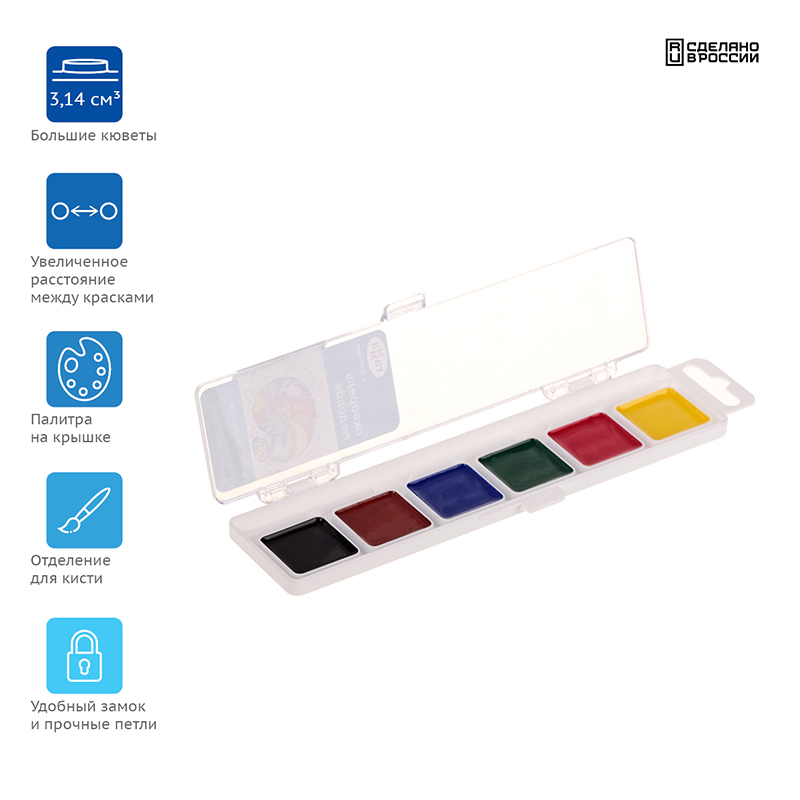 Кюветы с высокими бортиками и увеличенным расстоянием между красками предназначены для удобства в работе детей. Палитра для смешивания красок расположена на крышке. Акварель легко смывается с рук и отстирывается с одежды.