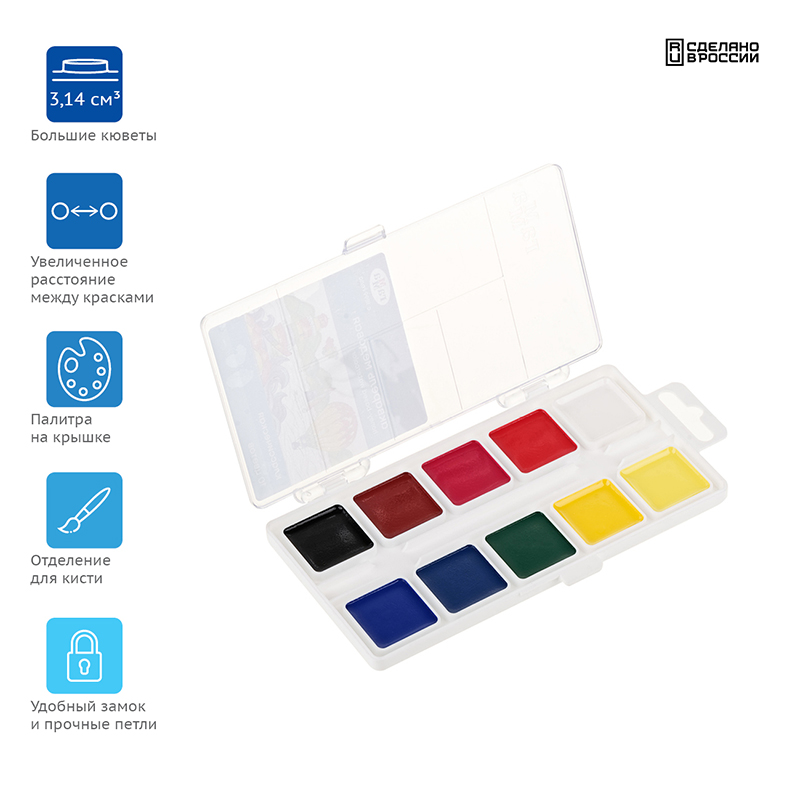 Кюветы с высокими бортиками и увеличенным расстоянием между красками предназначены для удобства в работе детей. Палитра для смешивания красок расположена на крышке. Акварель легко смывается с рук и отстирывается с одежды.