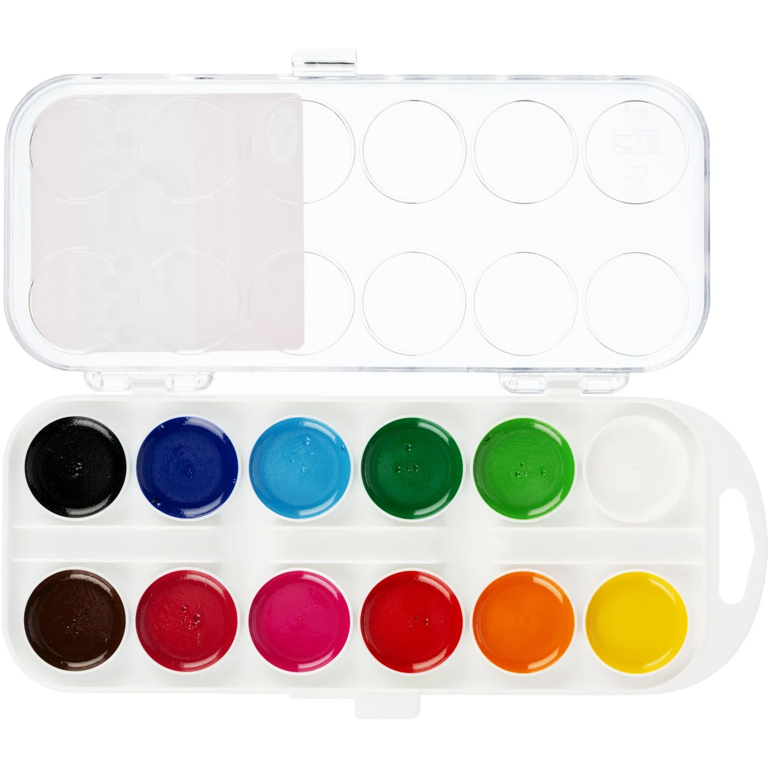 Набор включает 12 полусухих красок. Объём одной кюветы — 3,5 см³. Кюветы круглой формы с высокими бортиками и увеличенным расстоянием между цветами — для удобства детей в работе. Кисточка в комплект не входит.