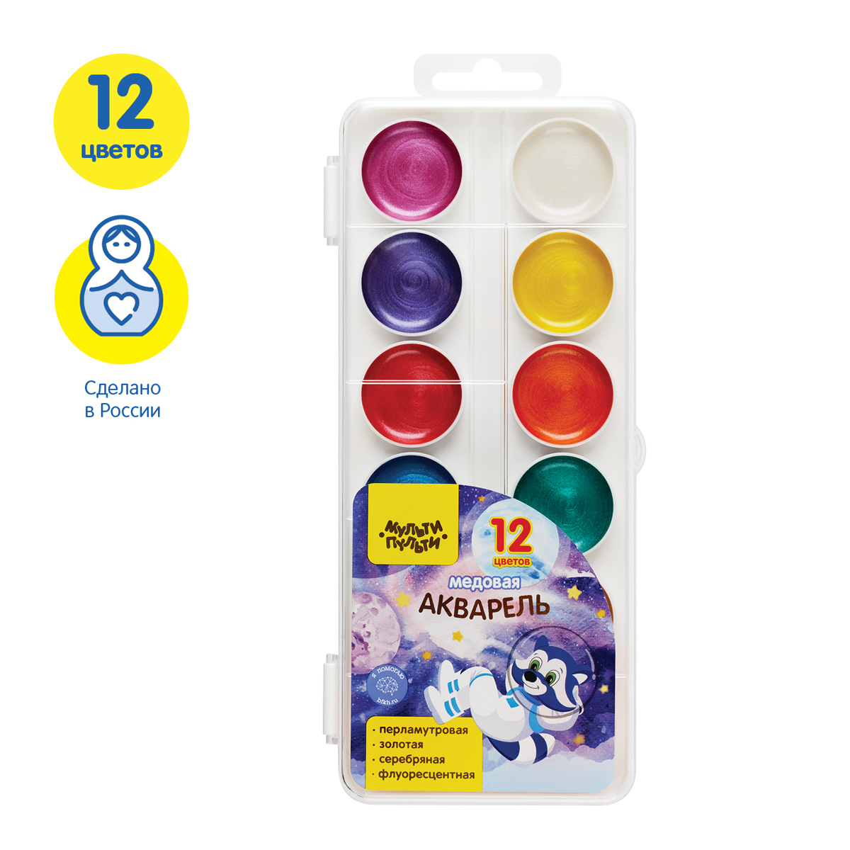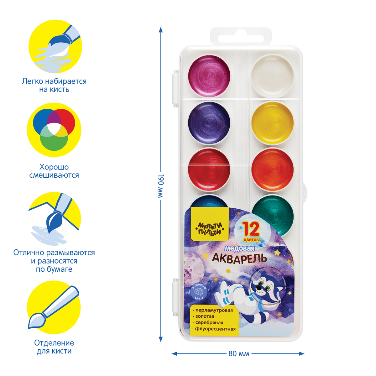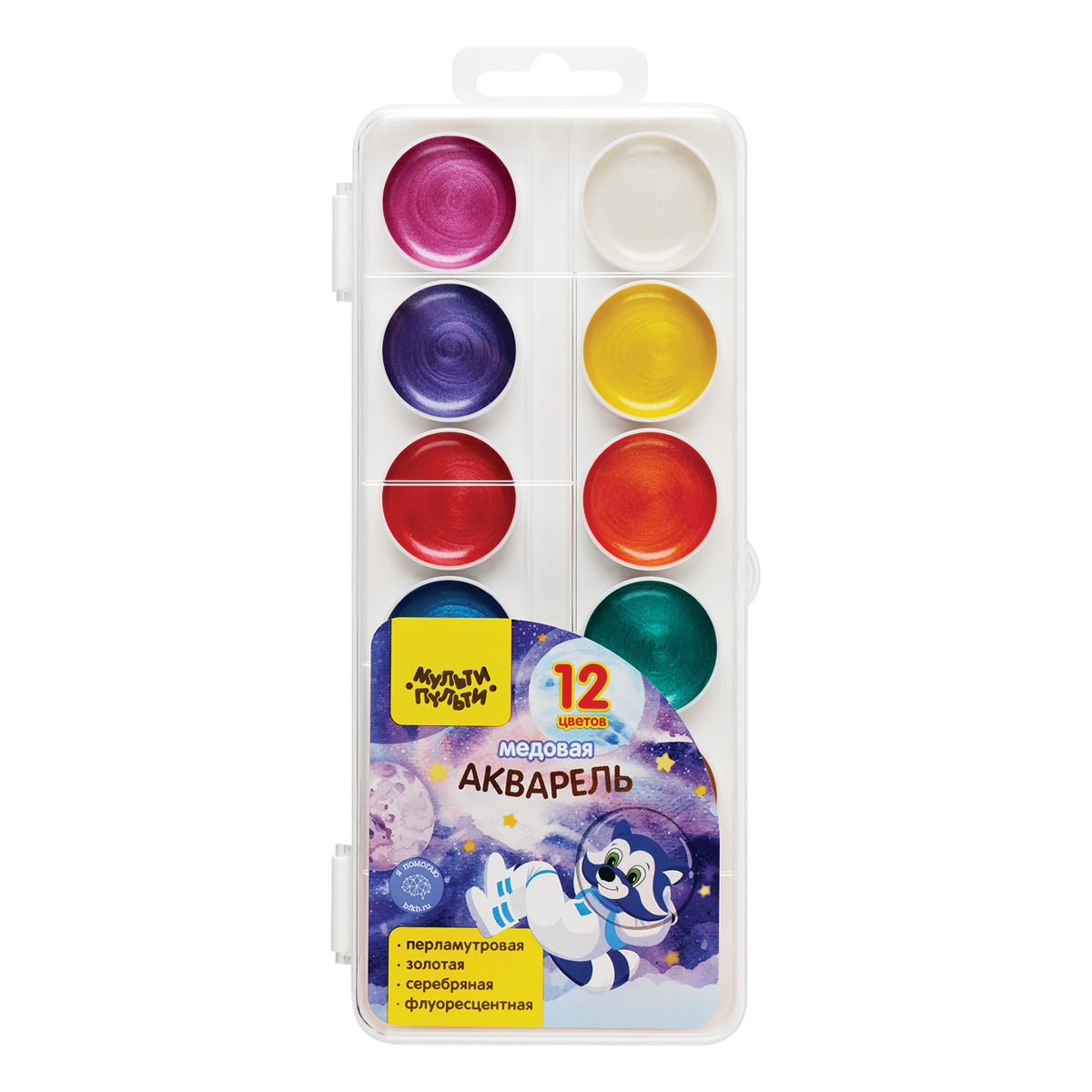 Акварель Мульти-Пульти "Енот в космосе", медовая, 12 цветов (8 перл.+золото+серебро+2 флуор.) без кисти, пластик