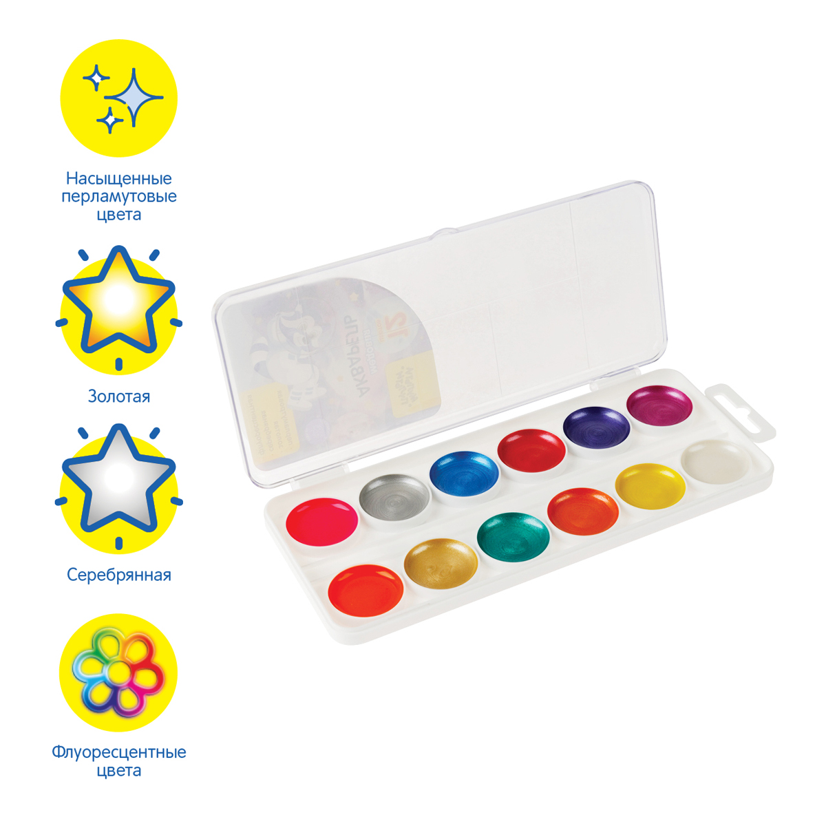 О товаре «Акварель Мульти-Пульти "Енот в космосе", медовая, 12 цветов (8 перл.+золото+серебро+2 флуор.) без кисти, пластик»