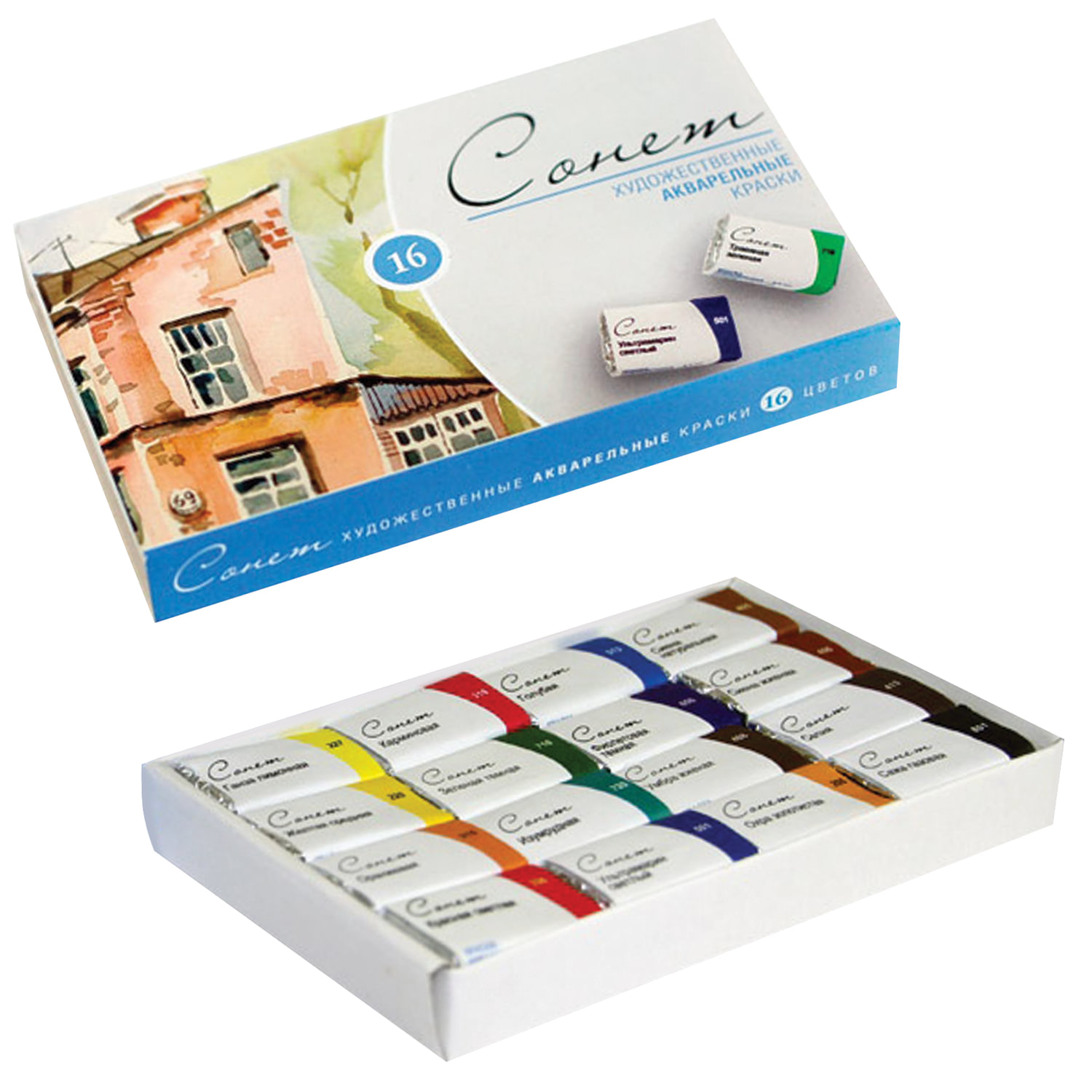 Художественные сухие акварельные краски Сонет предназначены для начинающих художников. Эти краски подходят для выполнения учебных работ, этюдов и эскизов. Изготавливаются по современным рецептурам на основе органических пигментов и синтетического связующего.