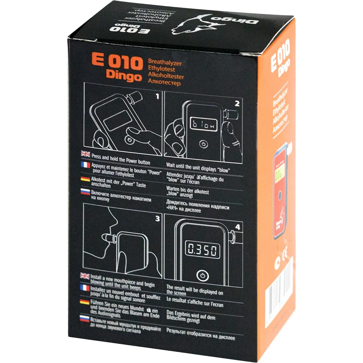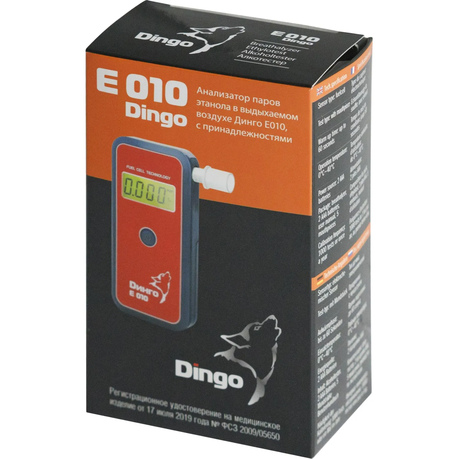 Алкотестер Динго Е-010 — прибор для измерения уровня массовой концентрации паров этанола в выдыхаемом воздухе оснащен сверхчувствительным электрохимическим сенсором, благодаря которому достигается высокая точность проведения теста. Оснащен системой контроля выдоха, имеет возможность работы как с мундштуком, так и без него. Динго Е 010 имеет регистрационное удостоверение Росздравнадзора и может использоваться для контроля трезвости персонала. Версия Динго Е-010 с USB-кабелем подключается к персональному компьютеру и позволяет сохранять результаты продуваний с фотофиксацией момента тестирования. Питание осуществляется от 2 батареек или аккумуляторов ААА.