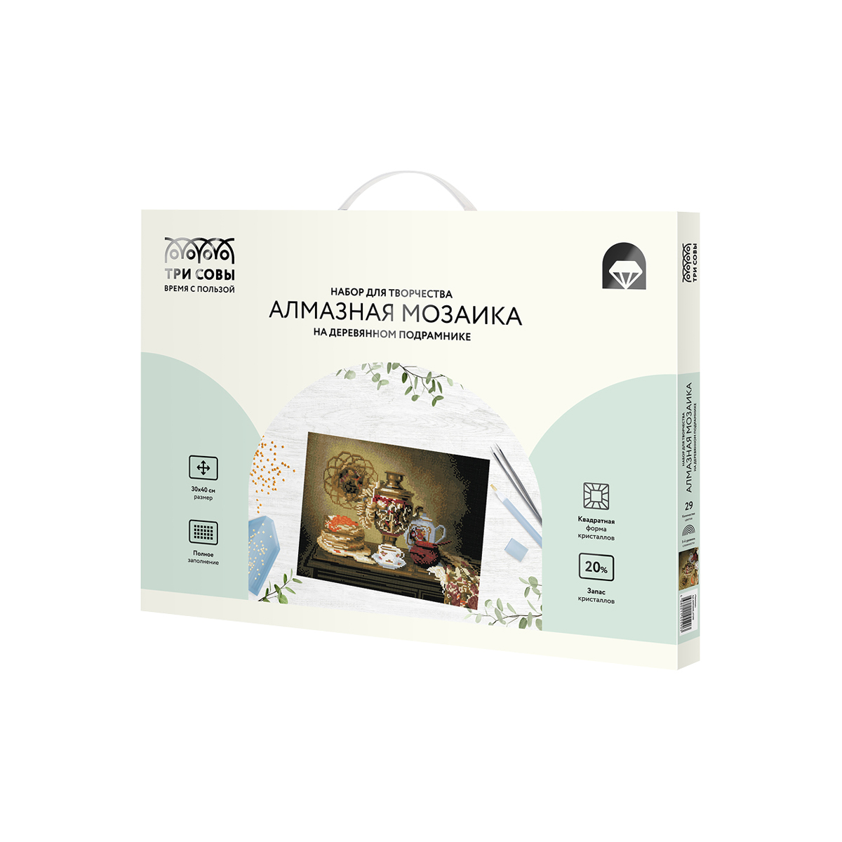 О товаре «Алмазная мозаика ТРИ СОВЫ "Чаепитие", 30*40см, холст на деревянном подрамнике, картонная коробка с пластиковой ручкой»