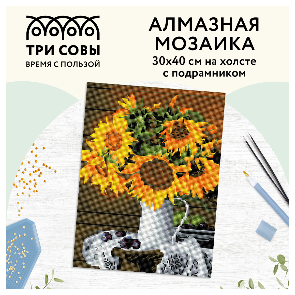 О товаре «Алмазная мозаика ТРИ СОВЫ "Подсолнухи", 30*40см, холст на деревянном подрамнике, картонная коробка с пластиковой ручкой»