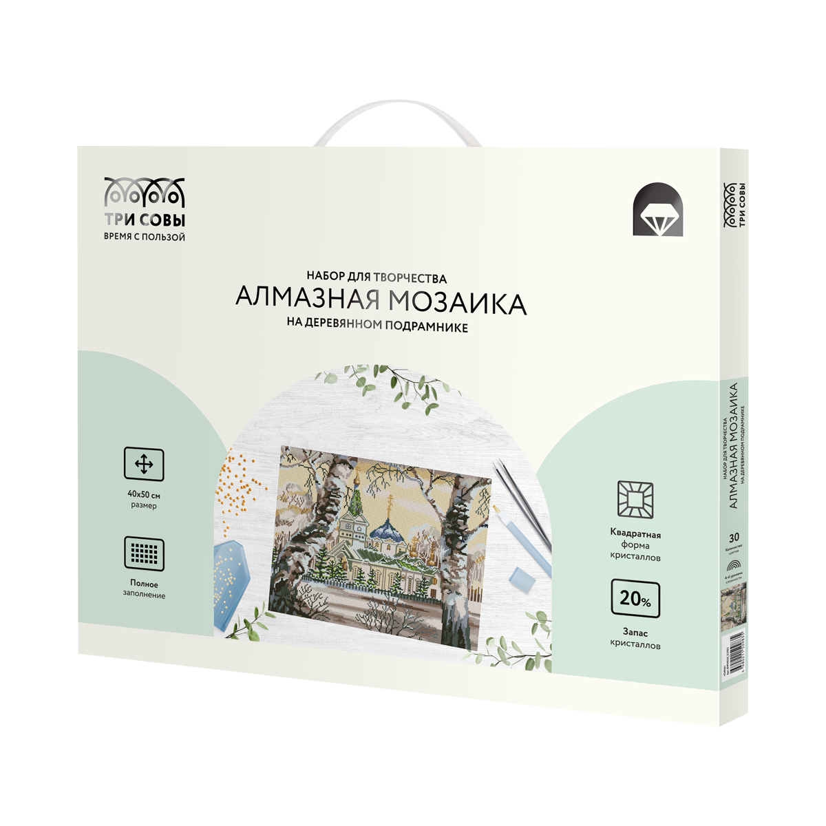 О товаре «Алмазная мозаика ТРИ СОВЫ "Собор", 40*50см, холст на деревянном подрамнике, картонная коробка с пластиковой ручкой»