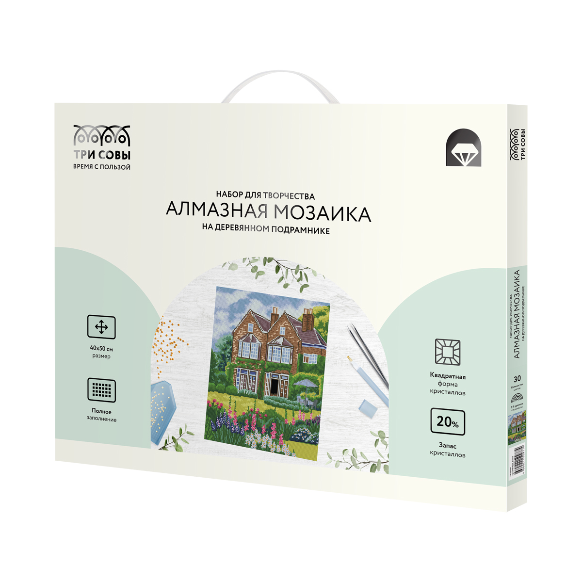 О товаре «Алмазная мозаика ТРИ СОВЫ "Усадьба", 40*50см, холст на деревянном подрамнике, картонная коробка с пластиковой ручкой»