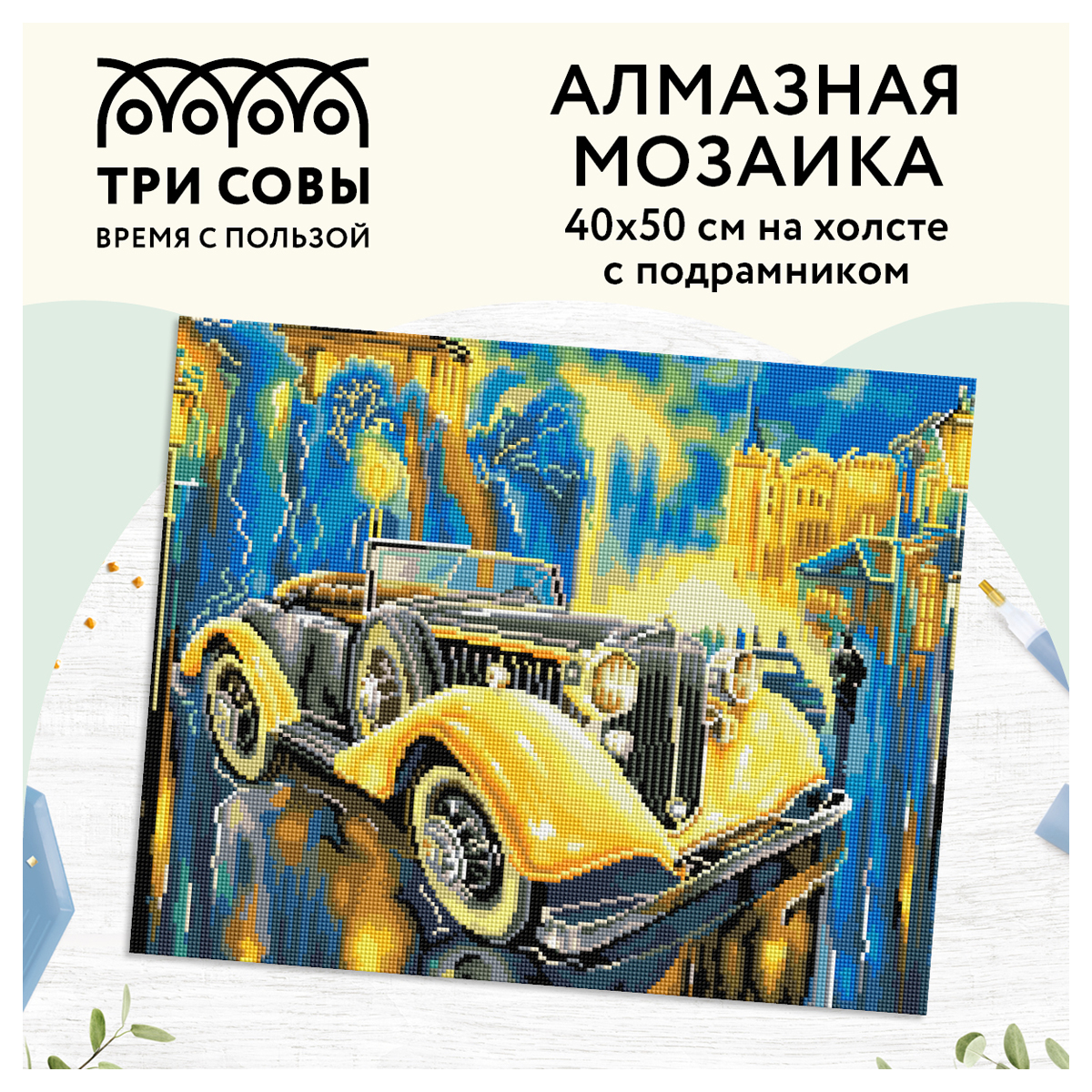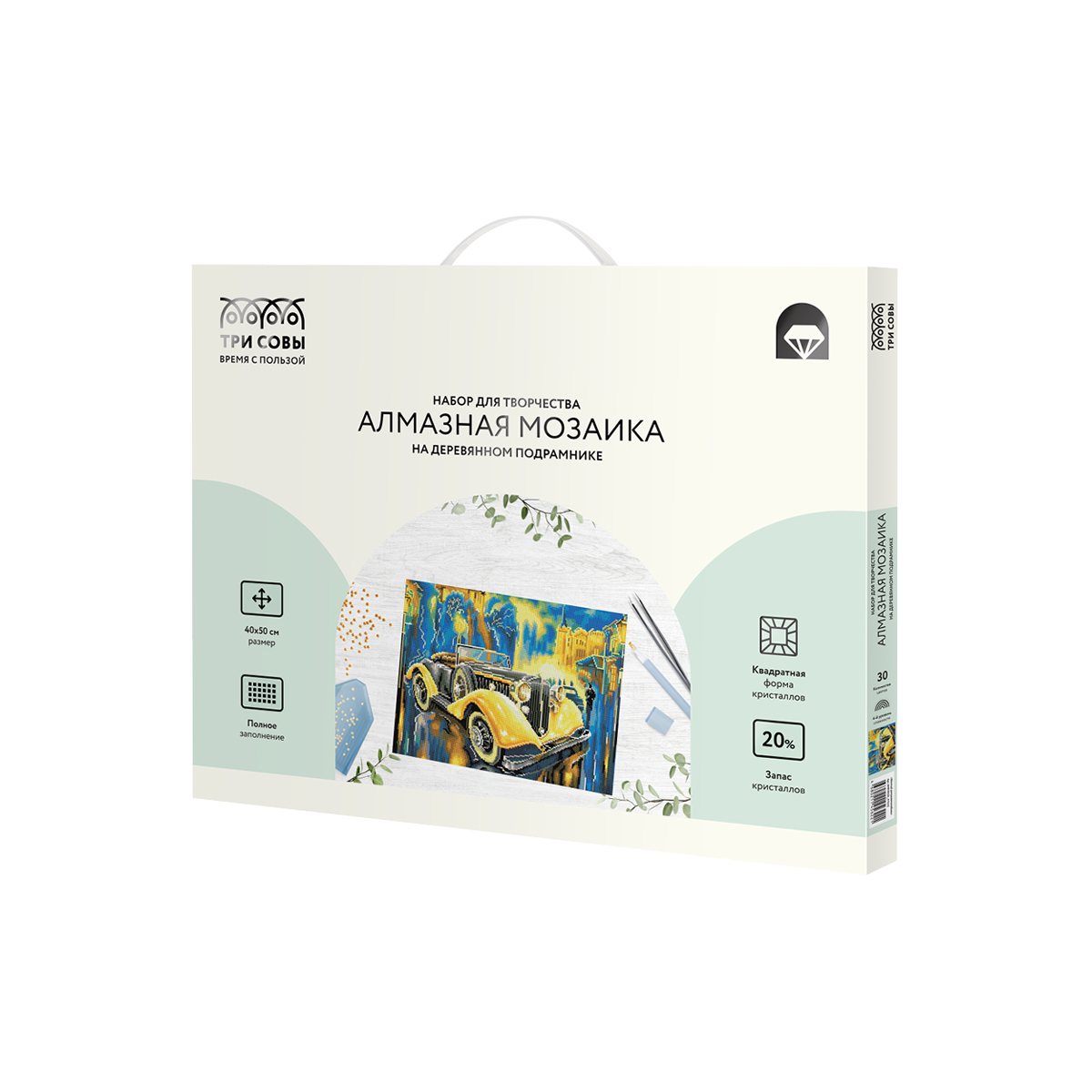 О товаре «Алмазная мозаика ТРИ СОВЫ "Желтый ретроавтомобиль", 40*50см, холст на деревянном подрамнике, картонная коробка с пластиковой ручкой»
