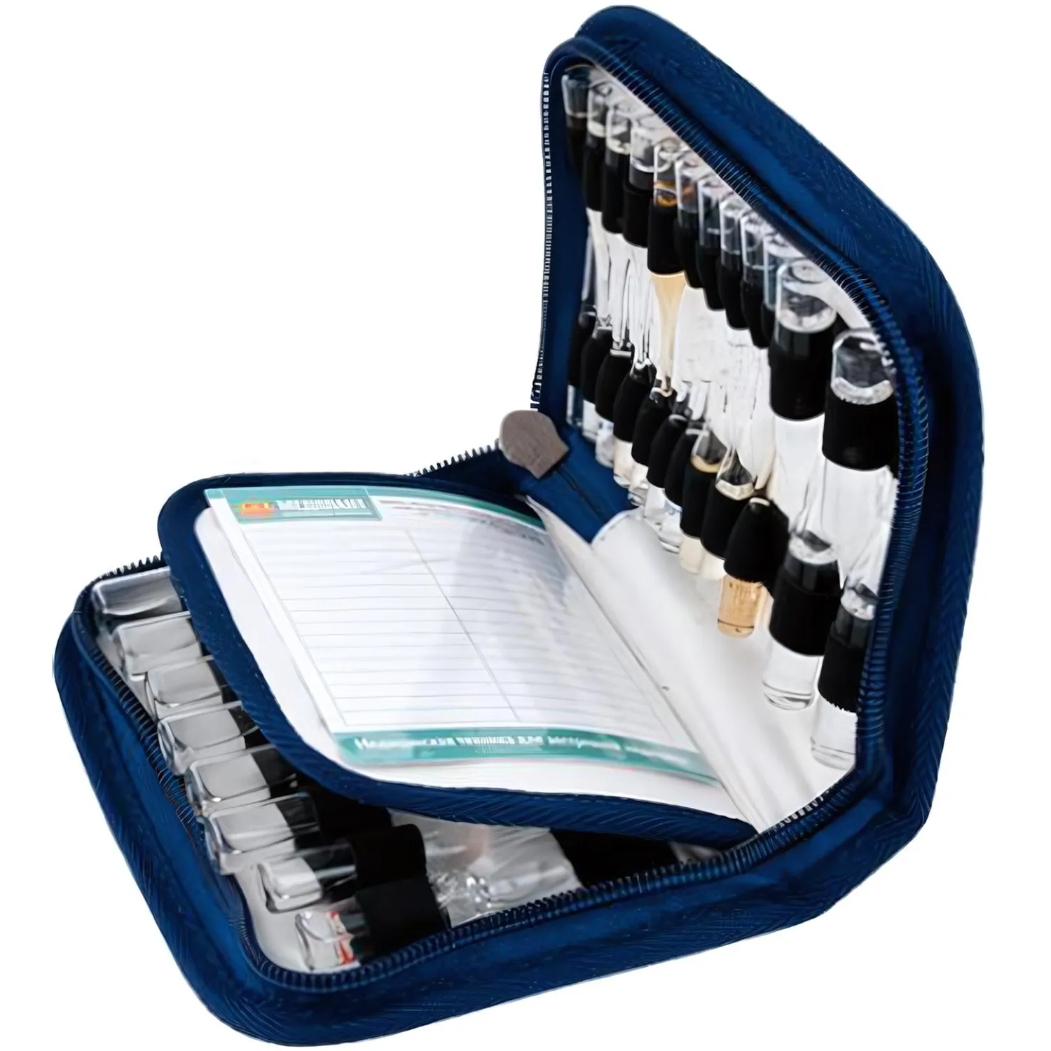 Ампульница тканевая АМ-32 предназначена для размещения, хранения и транспортировки ампул в футляре-укладке, медицинской сумке или отдельно. Размещение ампул в индивидуальных ячейках из эластичной резинки. Жесткий каркас. Закрывается на застежку ’молния’. Материал: ПВХ, ткань. Количество мест под ампулы — 32. Размер: 145×195×45 мм.