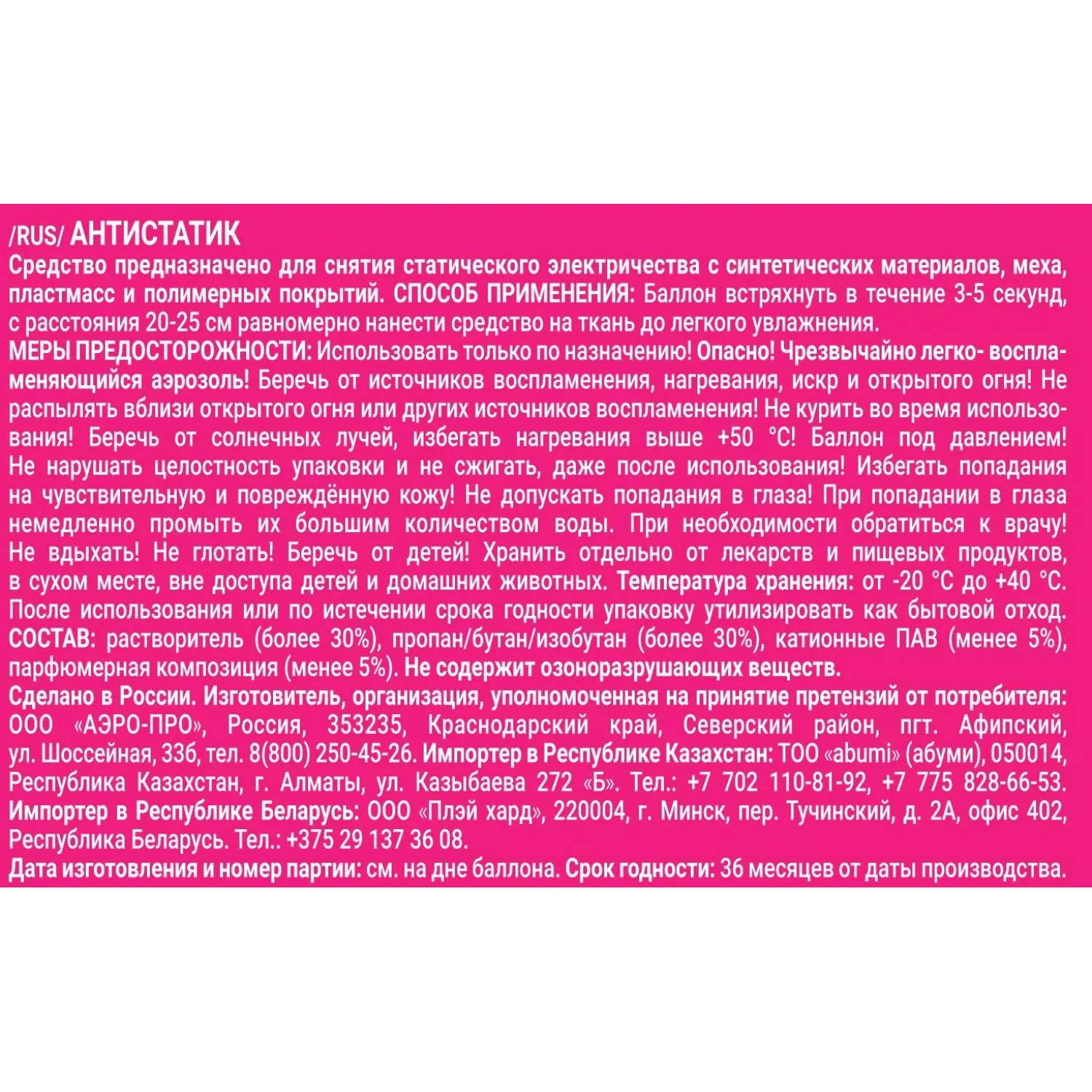 Меры предосторожности: использовать только по назначению! Опасно! Чрезвычайно легковоспламеняющийся аэрозоль! Беречь от источников воспламенения, нагревания, искр и открытого огня! Не распылять вблизи открытого огня или других источников воспламенения! Не курить во время использования! Беречь от солнечных лучей, избегать нагревания выше +50°C! Баллон под давлением! Не нарушать целостность упаковки и не сжигать, даже после использования! Избегать попадания на чувствительную и повреждённую кожу! Не допускать попадания в глаза! При попадании в глаза немедленно промыть их большим количеством воды. При необходимости обратиться к врачу! Не вдыхать! Не глотать! Беречь от детей! Хранить отдельно от лекарств и пищевых продуктов, в сухом месте, вне доступа детей и домашних животных. Температура хранения: от −20°C до +40°C. После использования или по истечении срока годности упаковку утилизировать как бытовой отход.