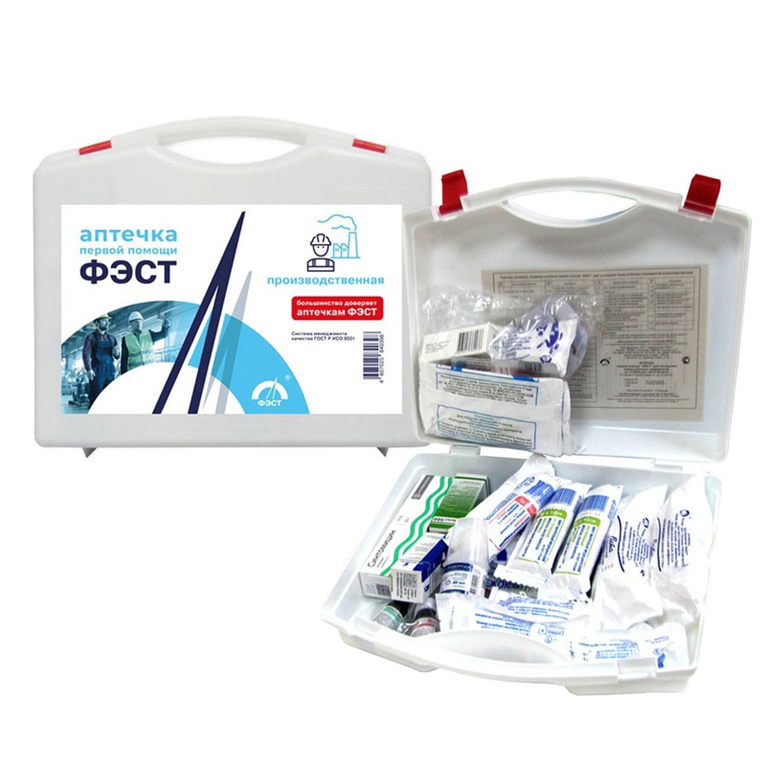 Аптечка первой помощи ФЭСТ для оснащения промышленных предприятий (производственная). Основное наполнение составляют перевязочные материалы для оказания первой медицинской помощи при получении травмы. Рассчитана на рабочий коллектив до 30 человек. Изготавливается в соответствии с ТУ производителя. ТУ 9398-037-10973749-2008 Состав: