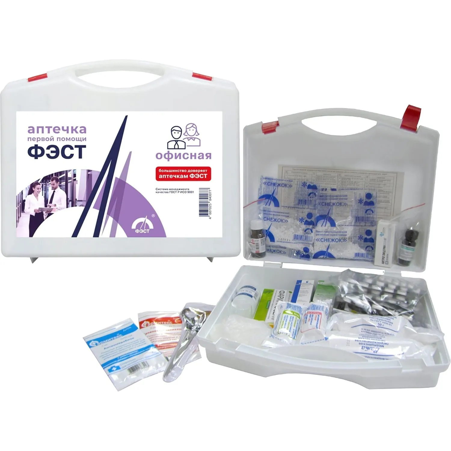 Аптечка первой помощи ФЭСТ для оснащения рабочих кабинетов, учреждений и организаций (офисная). Рассчитана на рабочий коллектив до 30 человек. Содержит все необходимое, чтобы оказать первую помощь при наиболее распространенных травмах и несчастных случаях, которые могут произойти непосредственно на рабочем месте. Изготавливается в соответствии с ТУ производителя (ТУ 9398-