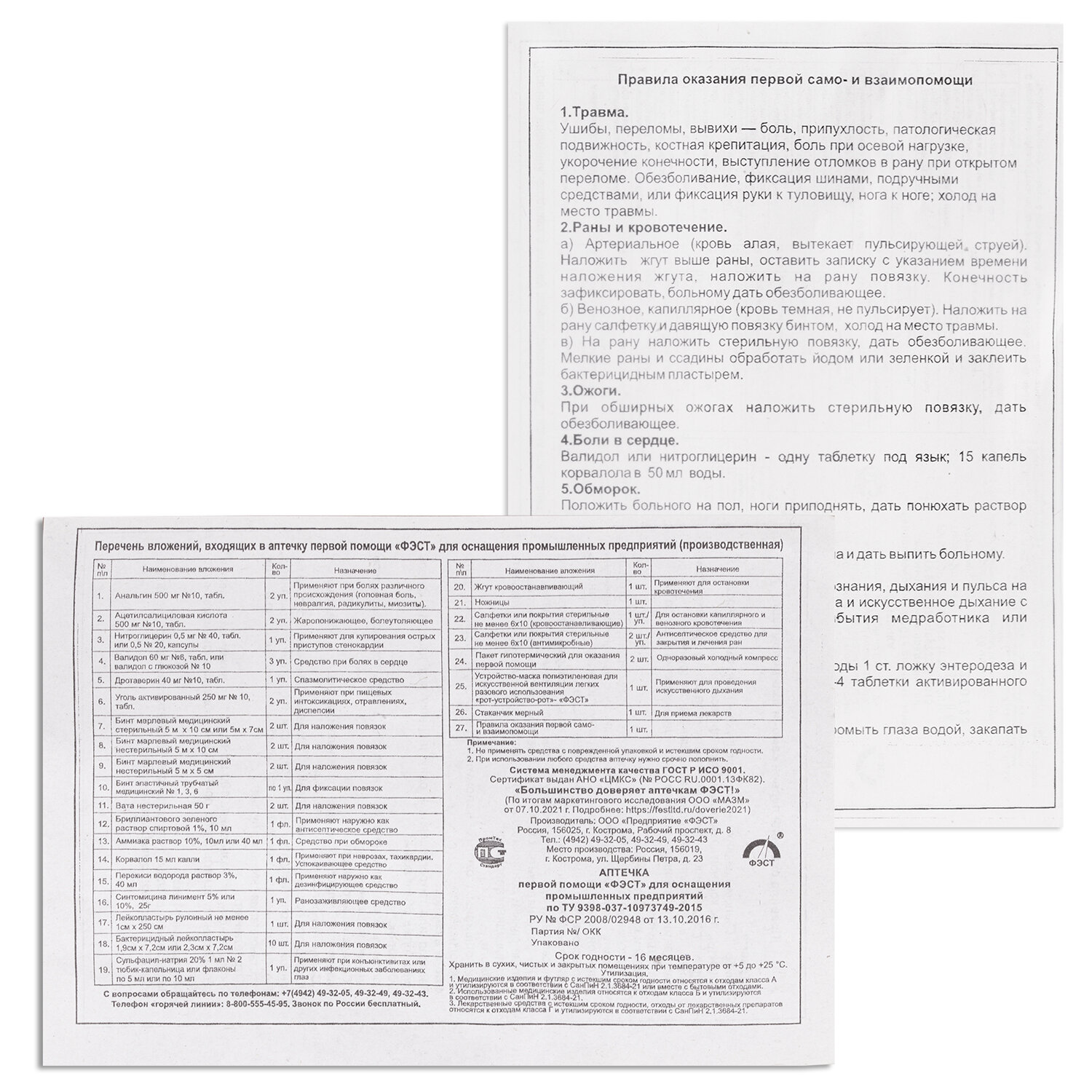 Аптечка первой помощи ФЭСТ для оснащения промышленных предприятий (производственная). Рассчитана на рабочий коллектив до 30 человек. Изготавливается в соответствии с ТУ производителя ТУ 9398-037-10973749-2015 РУ №ФСР 2008/02948 Состав аптечки: