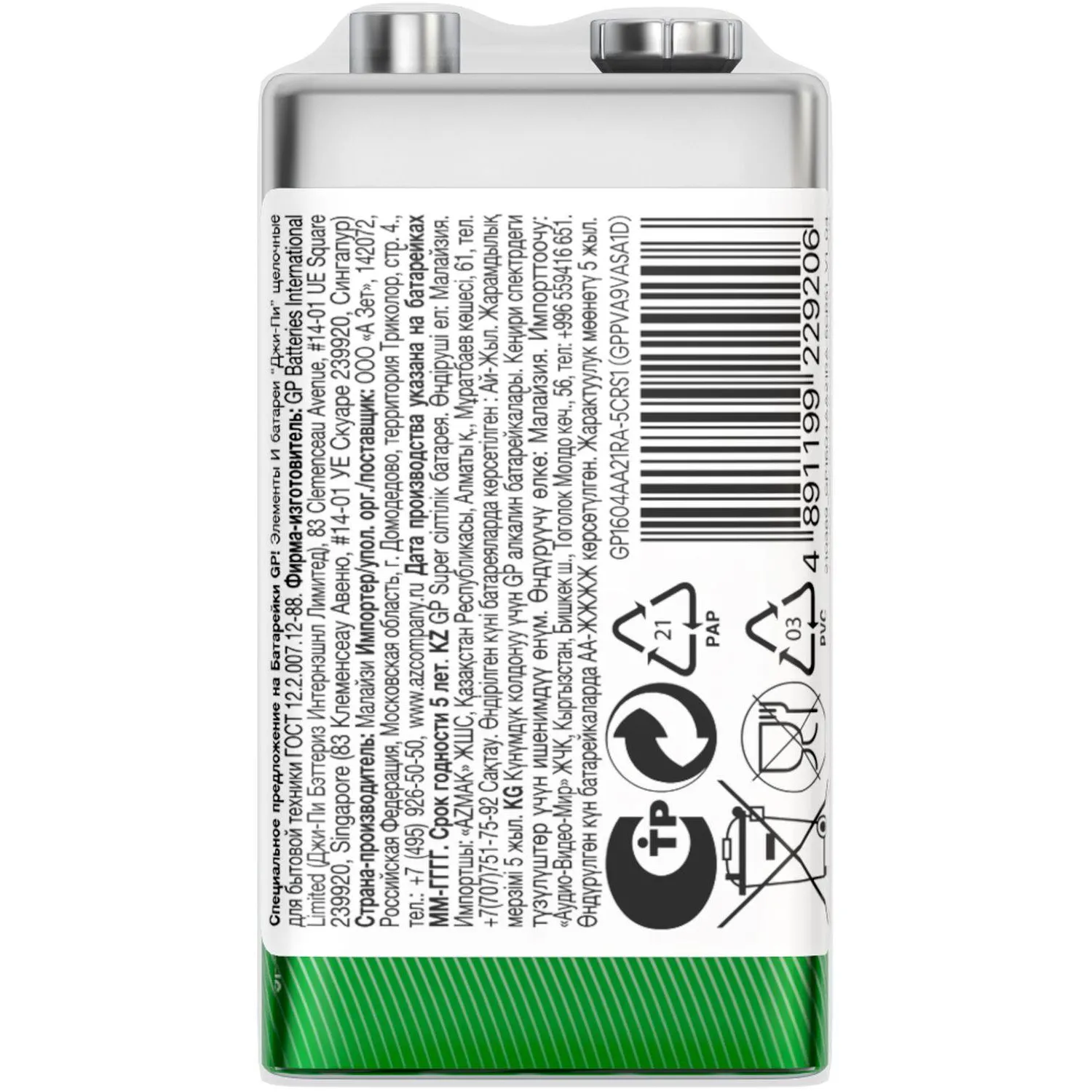 Щелочные батарейки GP SUPER "Крона" совершенно безопасны. Не содержат ртути и кадмия, не протекают. При правильном использовании не наносят вреда окружающей среде.