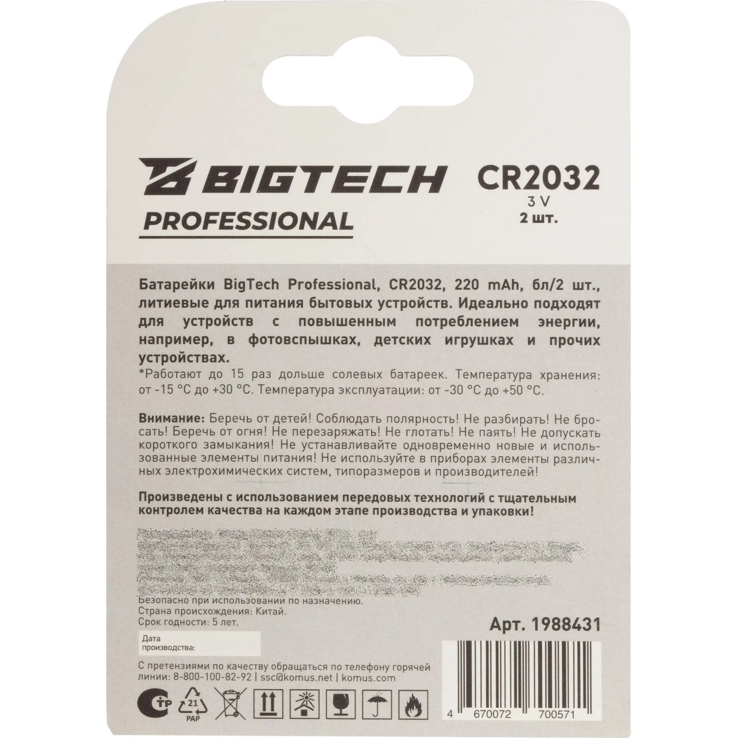 О товаре «Батарейка BigTech Professional, литиевая, CR2032, бл/2шт»