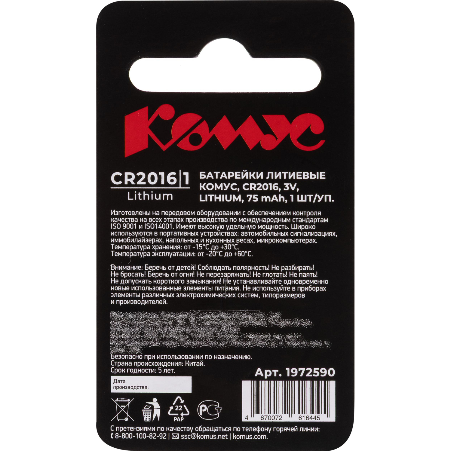 О товаре «Батарейка Комус, литиевая, CR2016, бл/1шт»