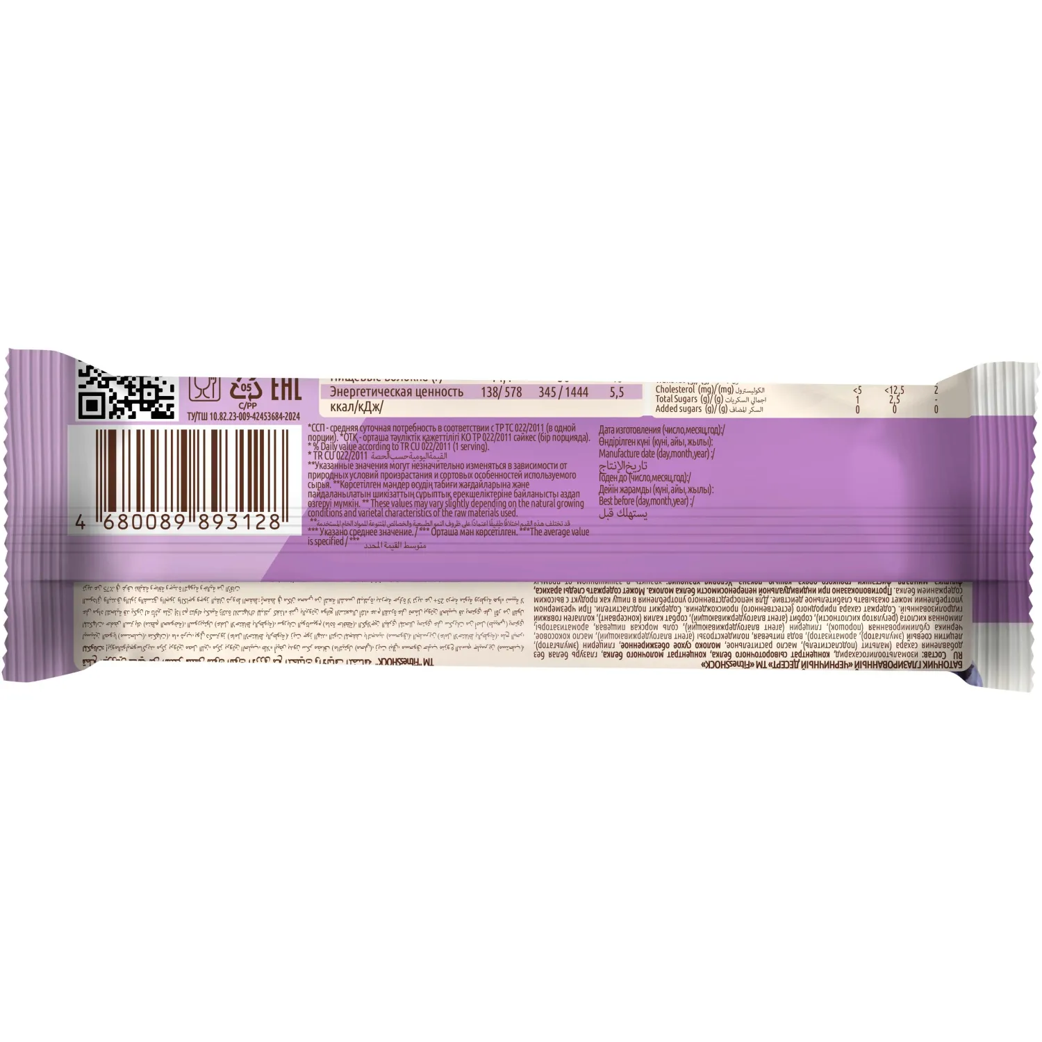 Состав: изомальтоолигосахарид, концентрат сывороточного белка, концентрат молочного белка, глазурь белая без добавления сахара (мальтит (подсластитель), масло растительное, молоко сухое обезжиренное, глицерин (эмульгатор), лецитин соевый (эмульгатор), ароматизатор), вода питьевая, полидекстрозы (агент влагоудерживающий), масло кокосовое, черника сублимированная (порошок), глицерин (агент влагоудерживающий), соль морская пищевая, ароматизаторы, лимонная кислота (регулятор кислотности), сорбит (агент влагоудерживающий), сорбат калия (консервант), коллаген говяжий гидролизованный.