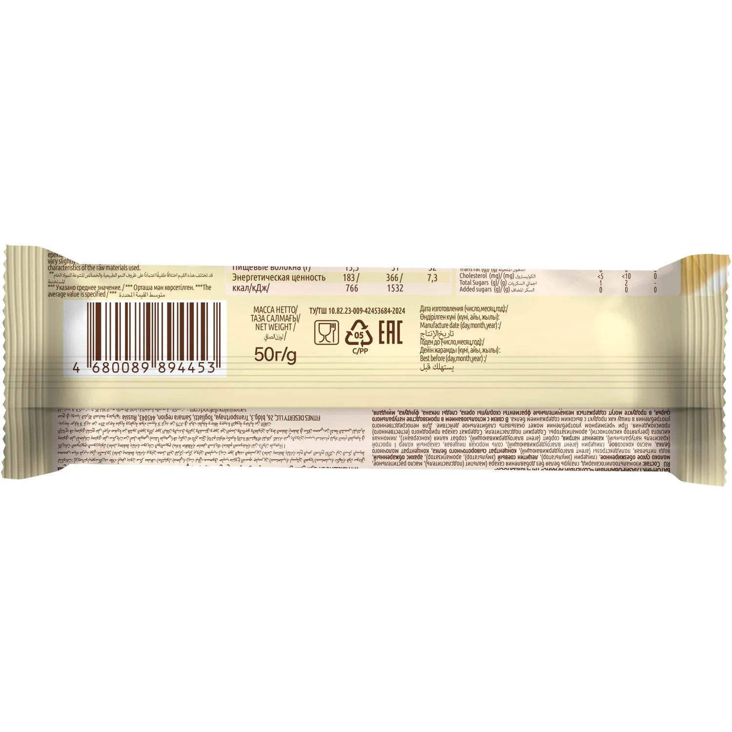 Состав: изомальтоолигосахарид, глазурь белая без добавления сахара (мальтит (подсластитель), масло растительное, молоко сухое обезжиренное, глицерин (эмульгатор), лецитин соевый (эмульгатор), ароматизатор), арахис обжаренный, вода питьевая, полидекстрозы (агент влагоудерживающий), концентрат сывороточного белка, концентрат молочного белка, масло кокосовое, глицерин (агент влагоудерживающий), соль морская пищевая, сахарный колер I простой (краситель натуральный), казеинат натрия, сорбит (агент влагоудерживающий) , сорбат калия (консервант), лимонная кислота (регулятор кислотности), ароматизаторы.