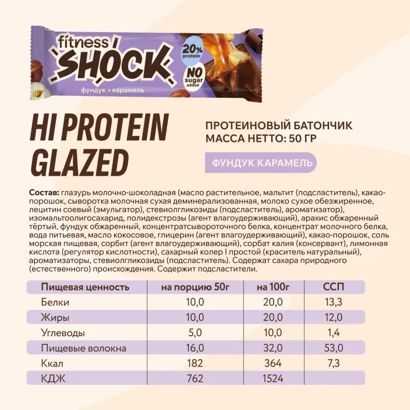 О товаре «Батончик протеиновый FitnessShock шоколадная карамель-фундук 50 г (12 штук в упаковке)»