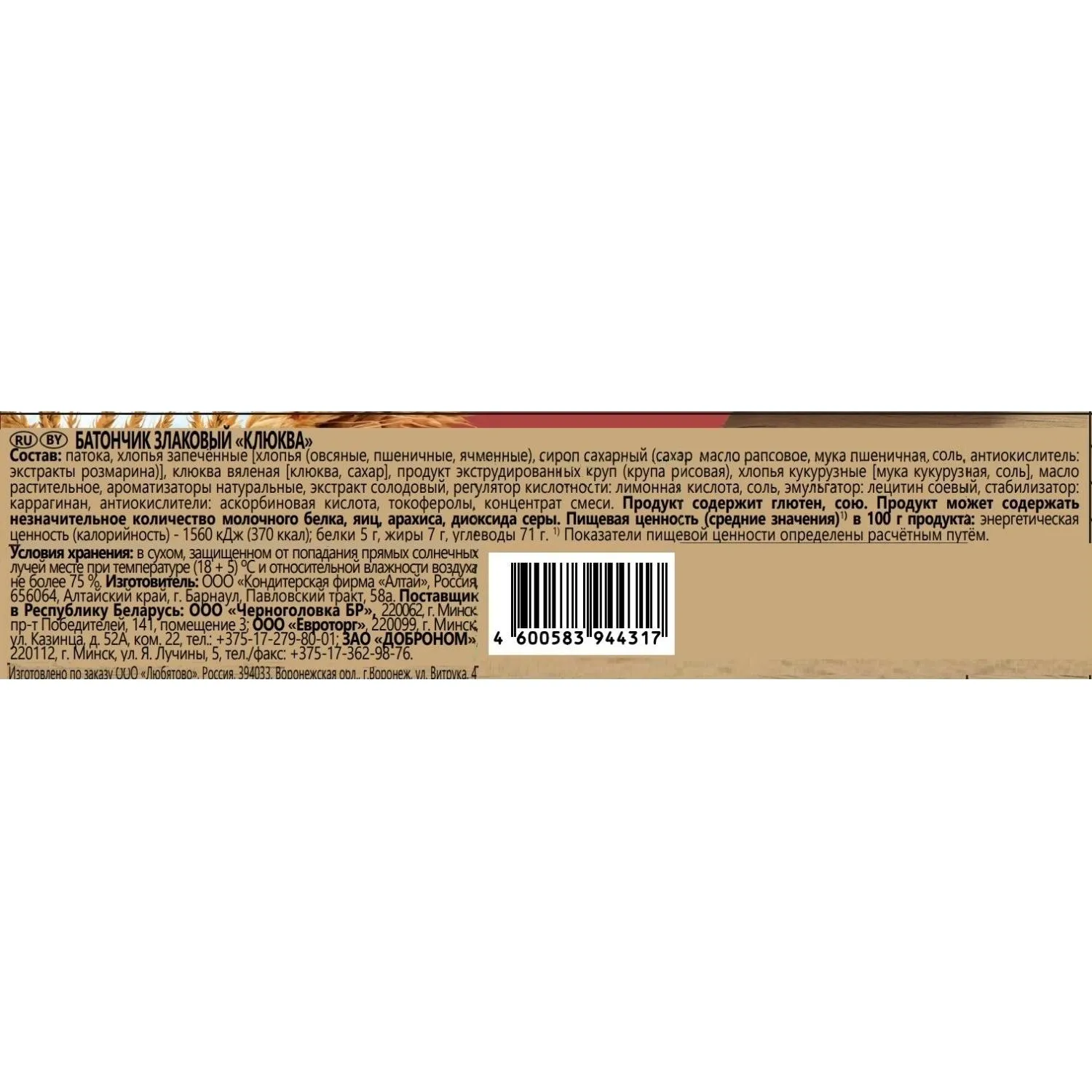 О товаре «Батончик злаковый Любятово с клюквой, 27гx25шт/уп»