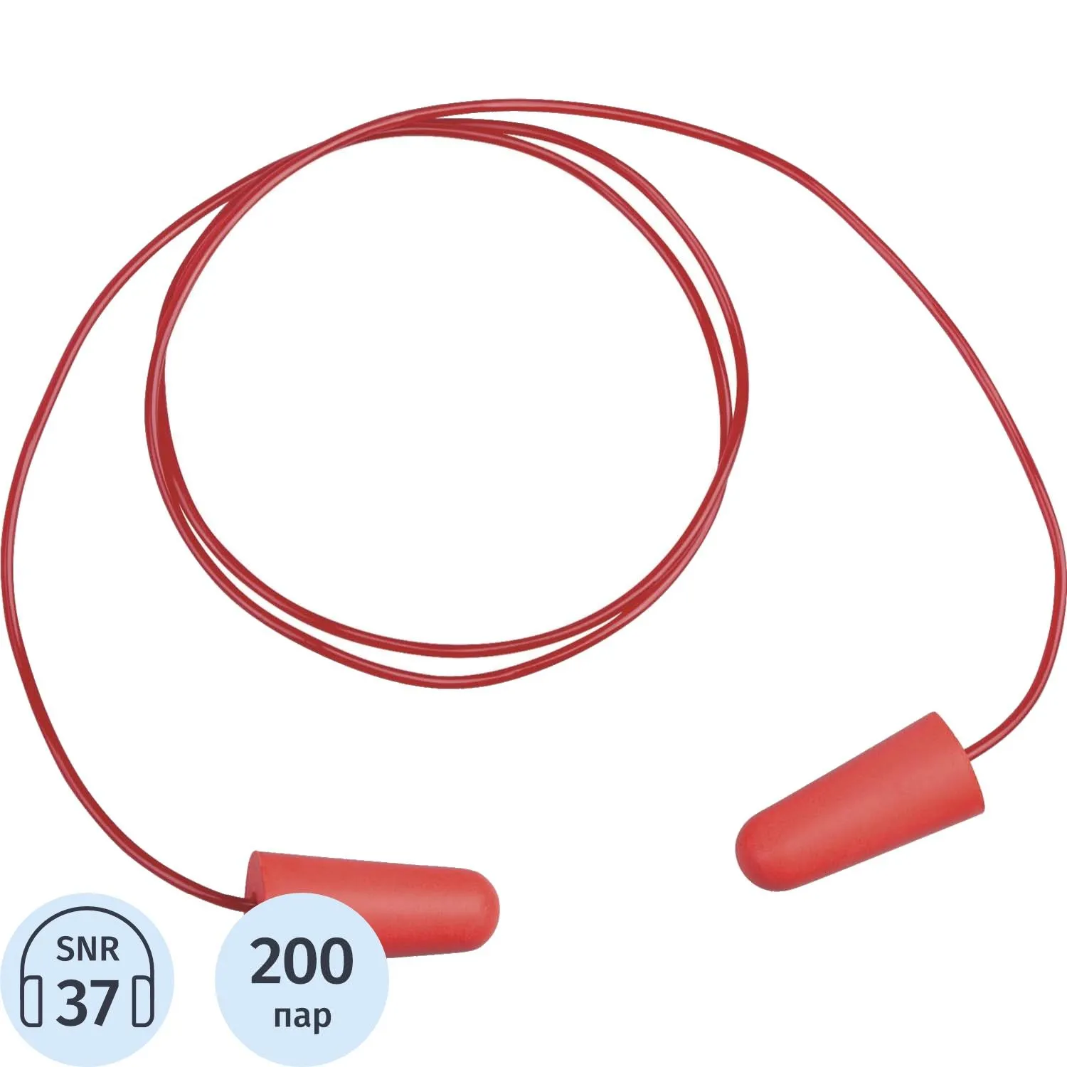 Полиуретановые беруши на пластиковом шнурке. Беруши с диаметром от 7 до 12 мм обеспечивают акустическую эффективность до 36 дБ. В упаковке содержится 200 пар (400 штук), каждая пара поставляется в индивидуальной пластиковой упаковке. Стандарты: ТР ТС 019/2011; ГОСТ 12.4.275-2014.