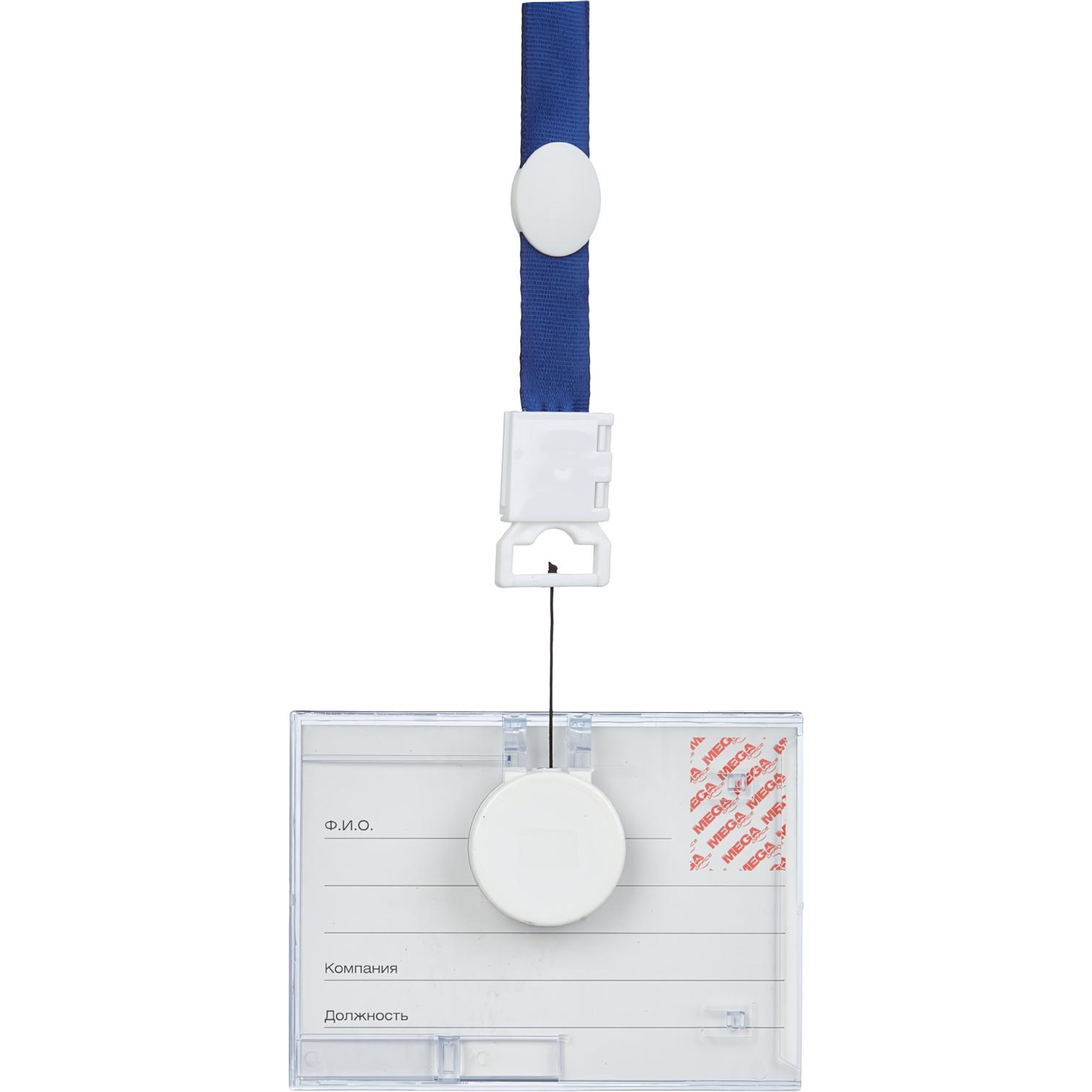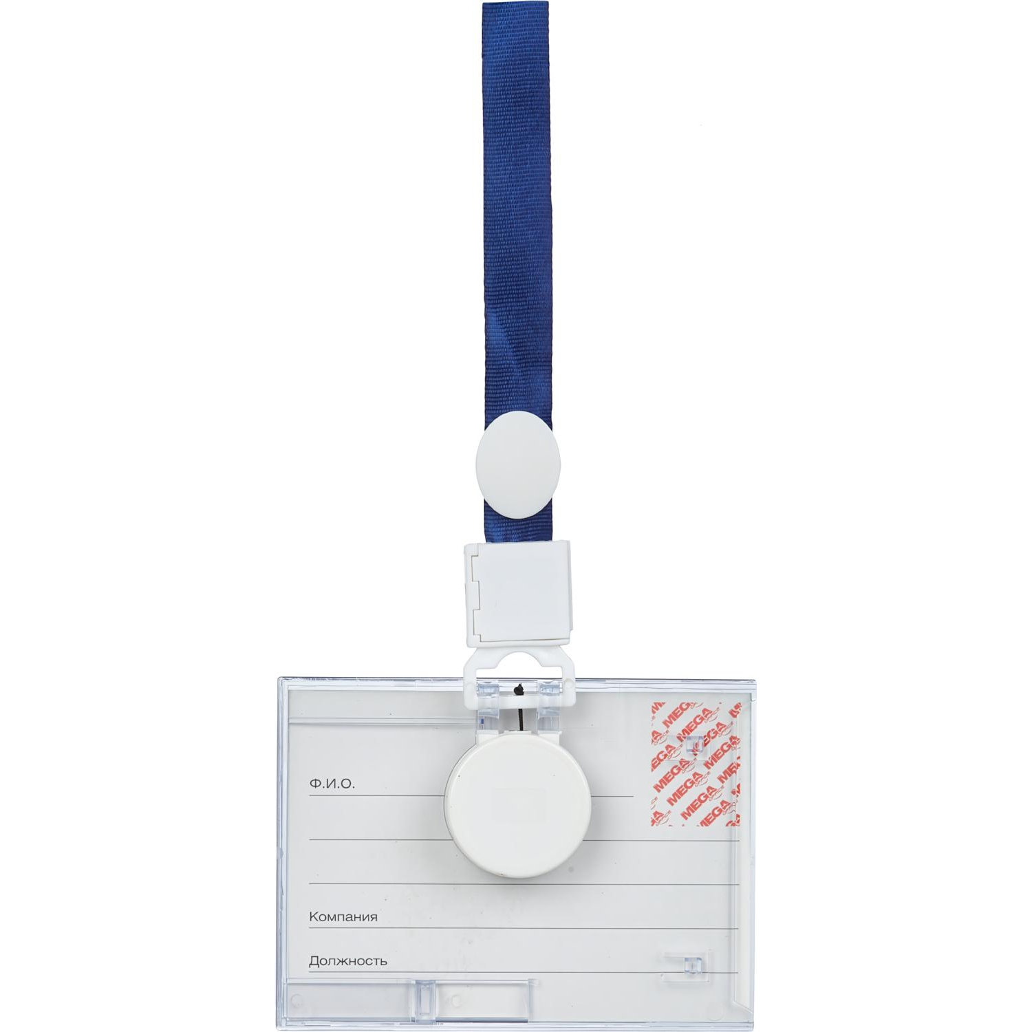 Бейдж ProMega office горизонтальный 105х74 мм с держателем-рулеткой и синей тесьмой (размер вкладыша: 105x74)