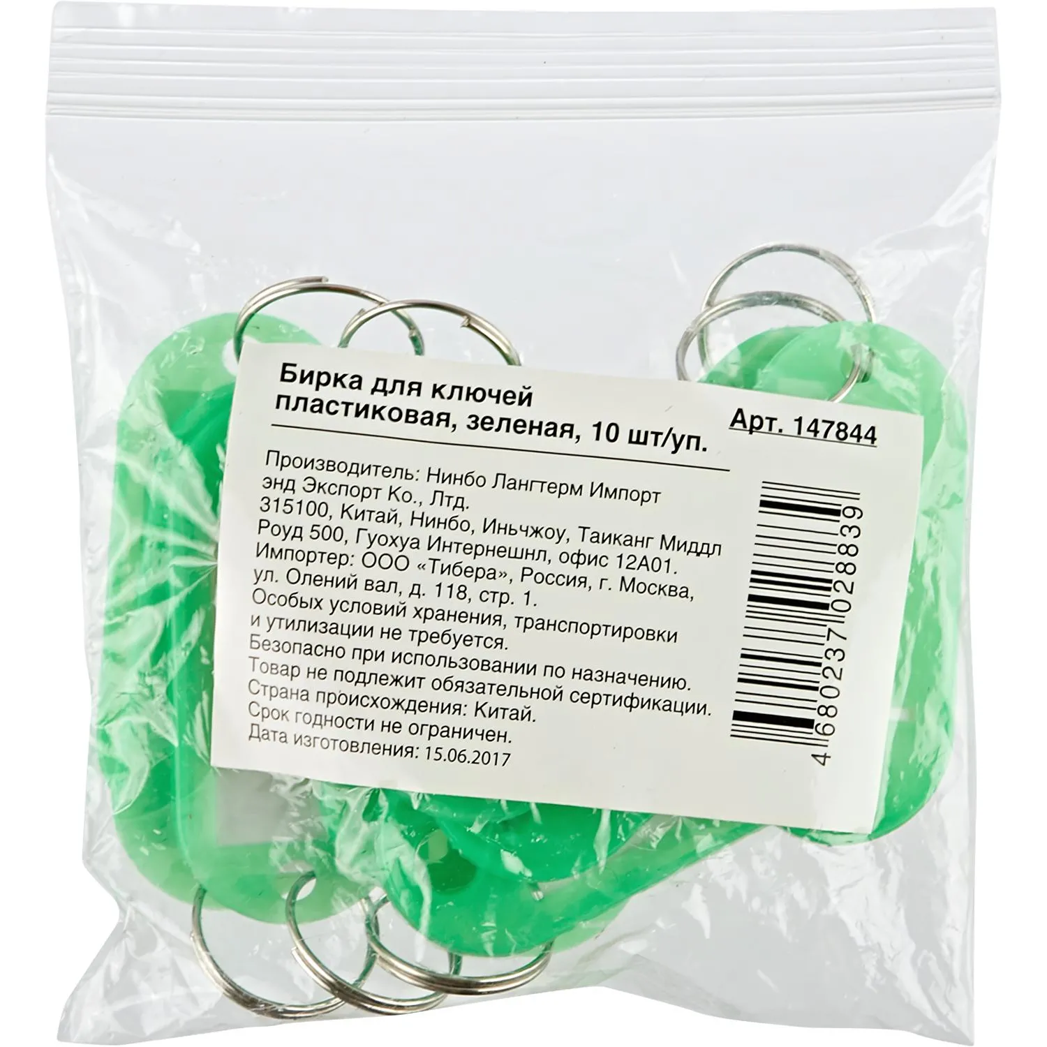 Бирки для ключей изготовлены из пластика зеленого цвета. Поставляются комплектом по 10 бирок в упаковке. Каждая бирка для ключей снабжена металлическим кольцом. Внутри бирки есть белый бумажный вкладыш, защищенный слоем пластика от повреждения и намокания. На вкладыш можно нанести надпись. Размер бирки 5×2см, размер окошка 3×1,5см..