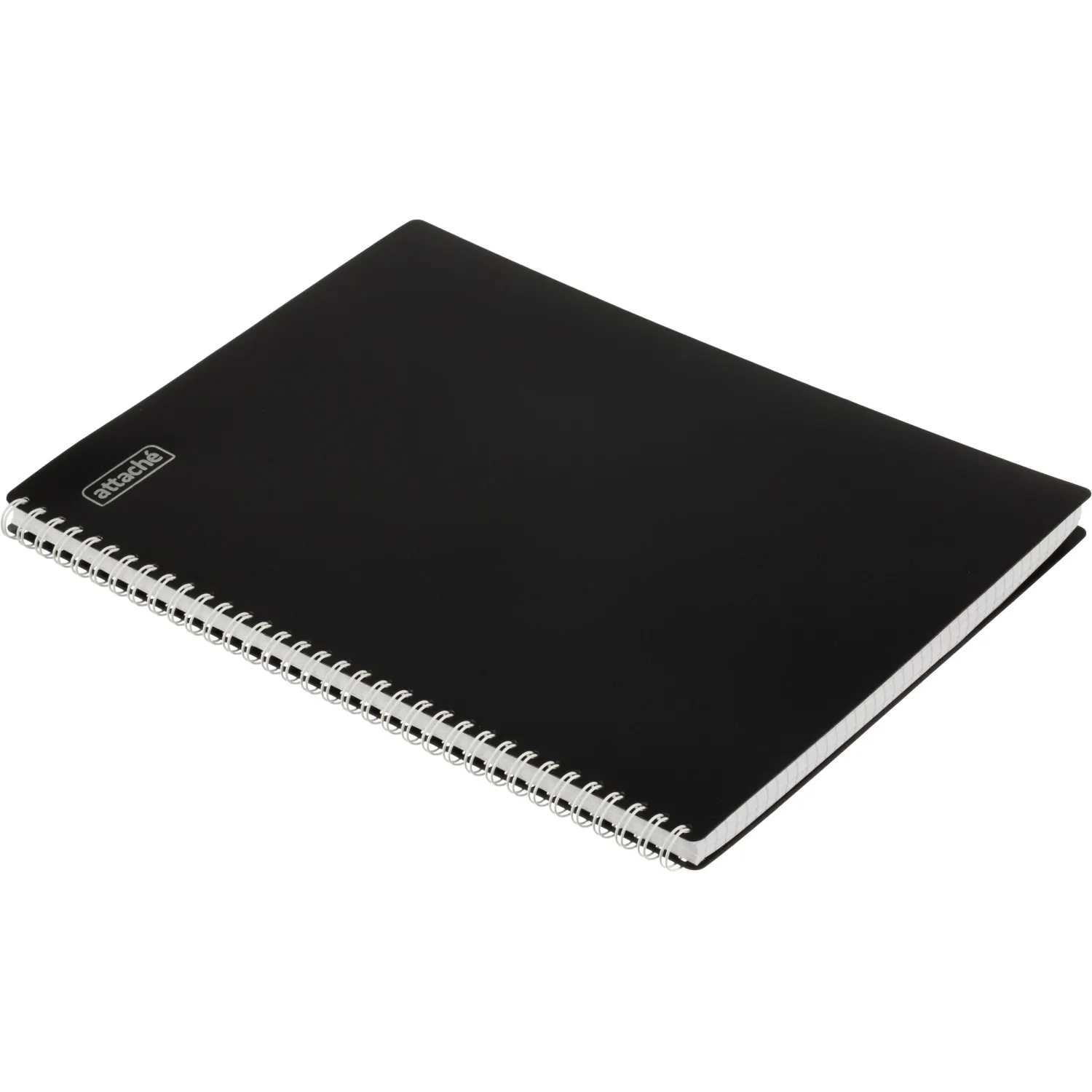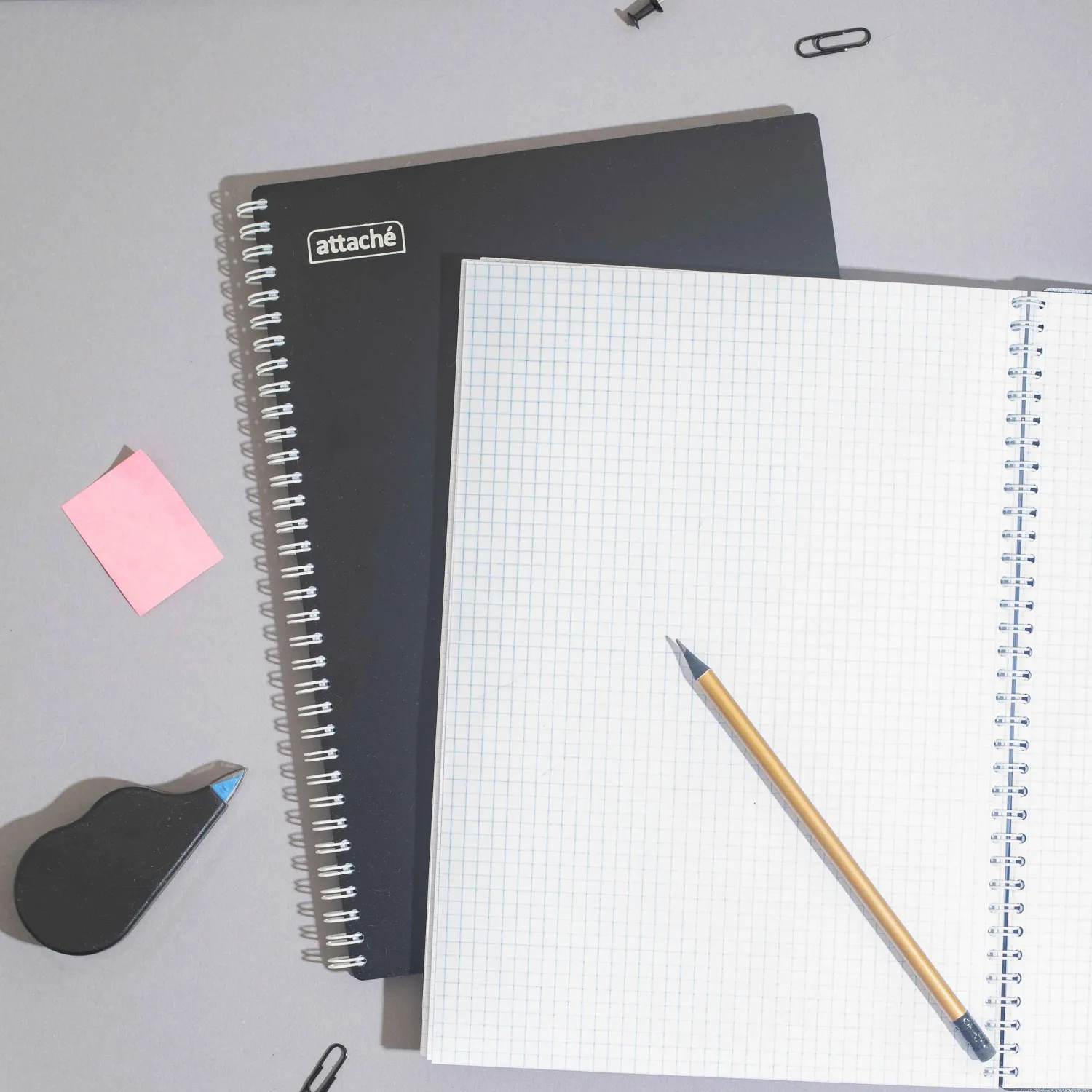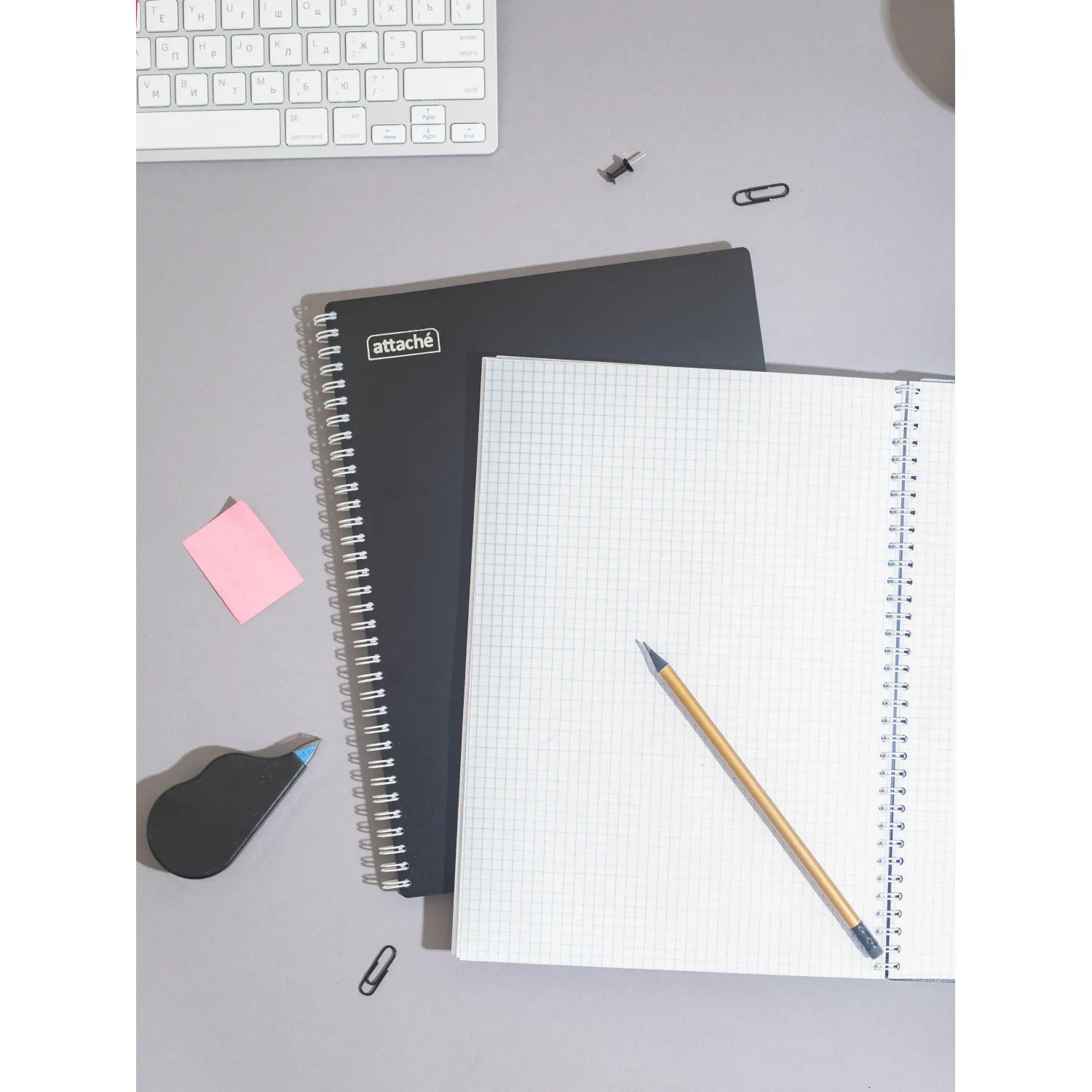 Бизнес-тетрадь Attache A4 на спирали предназначена для записей, используется в учебных заведениях и в офисе. Обложка изготовлена из цветного пластика чёрного цвета, плотность 200 мкр., с тиснением логотипа Attache фольгой. Крепление — спираль слева, по длинной стороне. Внутренний блок — белая офсетная бумага 65 г/кв.м, белизна — 100%. Тетрадь толщиной 120 листов в клетку. Размер тетради — 210×294 мм.