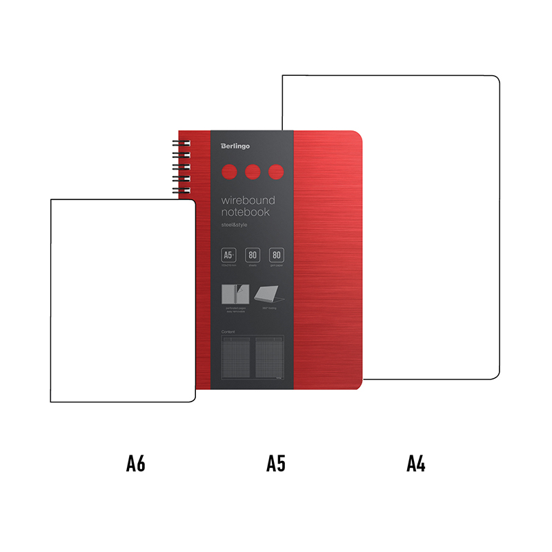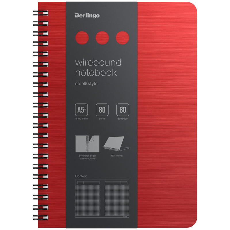 Бизнес-тетрадь А5+, 80л., Berlingo "Steel&Style", клетка, на гребне, 80г/м2, пластик. (полифом) обложка, линейка-закладка, красная