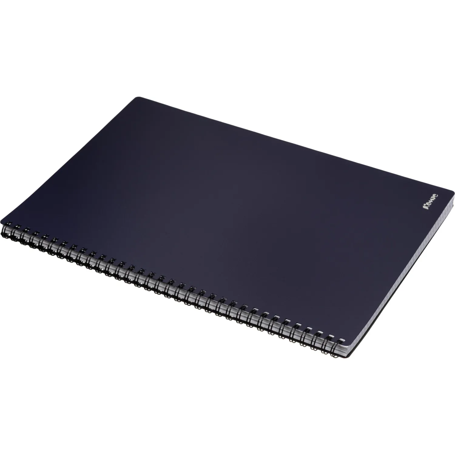 Обложка выполнена из пластика и имеет мягкую конструкцию. Лицевая сторона выполнена в синем цвете, внутренняя — в чёрном. Толщина пластика составляет 0.3 мм. Оформление дополнено тиснением логотипа Комус серебристой фольгой. Внутренний блок скреплён слева по длинной стороне металлическим креплением типа гребень — евроспиралью чёрного цвета, которая обжимает корешок и обеспечивает надёжную фиксацию листов и удобство перелистывания. Изделие произведено в России и поставляется по одной штуке.