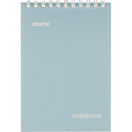 Блокнот Attache формата А6 на спирали. Предназначен для записей. Используется в старших классах, студентами и в офисе. Обложка изготовлена из мелованного картона с цветной печатью, плотность — 200 г/кв.м. Внутренний блок — не тонированная бумага, офсетная 60 г/кв.м, белизна — 100%. Дизайн обложки однотонный, в стильных пастельных тонах (голубой). Блокнот толщиной 40 листов в клетку. Размер блокнота — 102×146 мм.