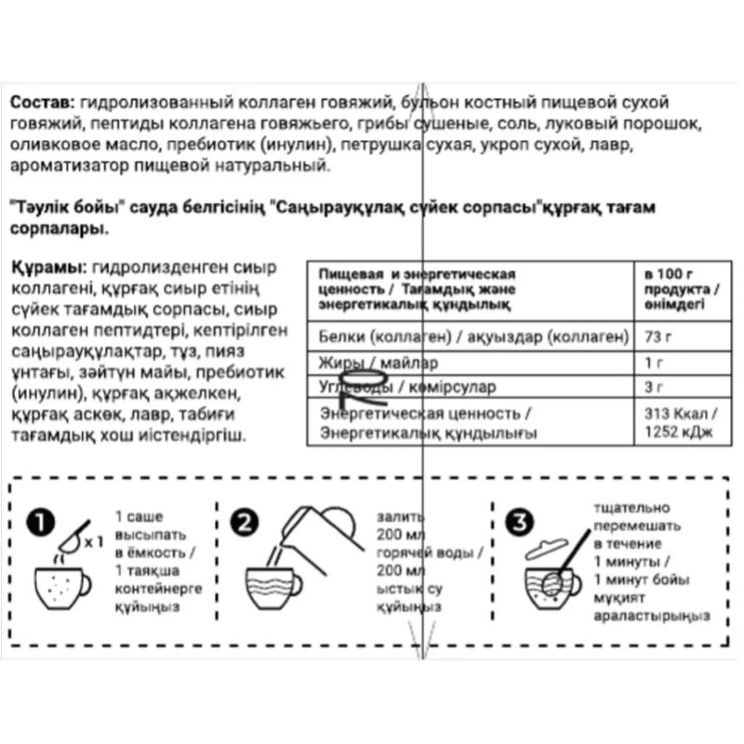 Состав: гидролизованный коллаген говяжий, бульон костный пищевой сухой говяжий, пептиды коллагена говяжьего, грибы сушёные, соль, луковый порошок, масло оливковое, пребиотик (инулин), лавр, петрушка сухая, укроп сухой, ароматизатор пищевой натуральный.