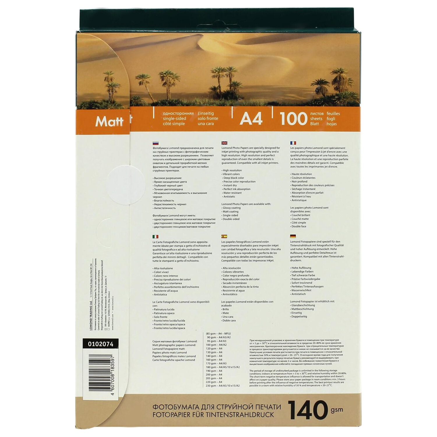 Данный вид бумаги используется для печати фотореалистичных проспектов, рекламных листов, портфолио, фотопортретов и прочих типографических материалов. Для легких сортов рекомендуется умеренная «заливка» листа чернилами. Фотобумага Lomond средней и высокой плотности используются при интенсивной «заливке». Чернила быстро впитываются и сохнут. Поэтому практически сразу можно печатать на обратной стороне. Матовое покрытие при сильном увеличении имеет вид гористого рельефа. Поэтому отраженный свет рассеивается под разными углами. Изображение, отпечатанное на матовой бумаге, не бликует, линии высококонтрастны, чистые тона имеют характерную бархатистую глубину. Данная бумага лучше подходит для печати таких изображений (например, иллюстрированных текстов), которые не должны утомлять глаз. Лицевая сторона — матовая. Обратная сторона — не используется. Формат A4 (210×297 мм). Плотность 140 г/кв.м. В упаковке 100 листов. Максимальное разрешение печати 2880 dpi.