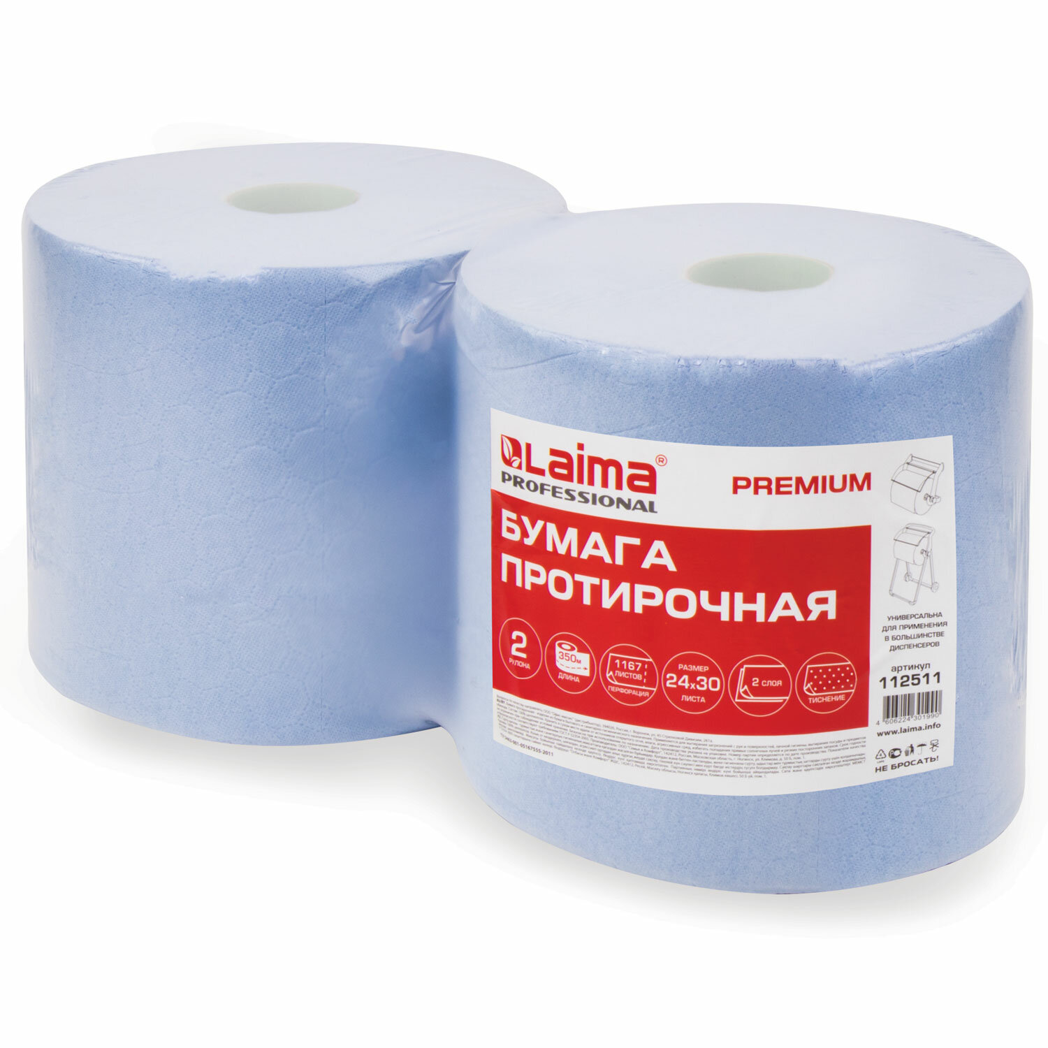 О товаре «Бумага протирочная 350 м, LAIMA (Система W1) PREMIUM, 2-слойная, 1167 листов в рулоне размером 24х30 см в рулоне, КОМПЛЕКТ 2 рулона, 112511»