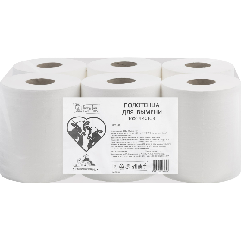 Бумага протирочная в рулоне для вымени 1000 листов 18x20 см белая 2-слойная (6 штук в упаковке)