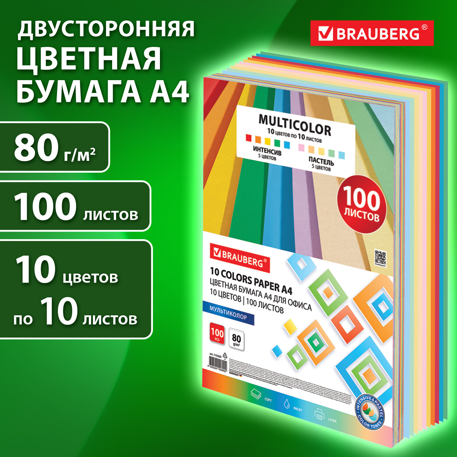 Бумага цветная 10 цветов BRAUBERG MULTICOLOR А4, 80 г/м2, 100 л. (10 цветов x 10 листов), 115350