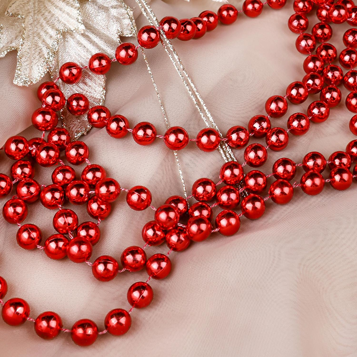Бусы новогодние красного цвета используются для украшения ёлки и интерьера. Они ярко выделяются на фоне зелёной хвои и подчёркивают праздничное оформление. Такой декор можно применять и для украшения каминов, окон или мебели, создавая выразительные акценты в композиции.