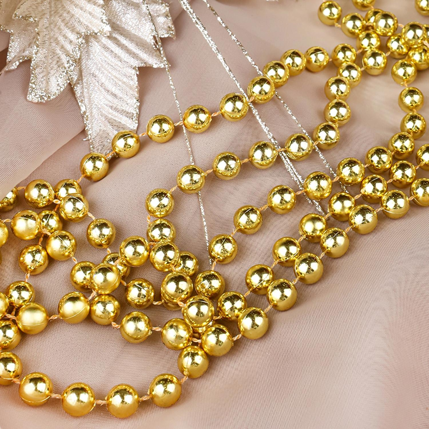 Бусы новогодние золотистого цвета используются для украшения ёлки и предметов интерьера. Они красиво переливаются на фоне хвои и подчёркивают праздничное оформление, делая его более выразительным. Такой декор можно применять также для украшения каминов, окон или мебели, создавая завершённый и гармоничный образ.