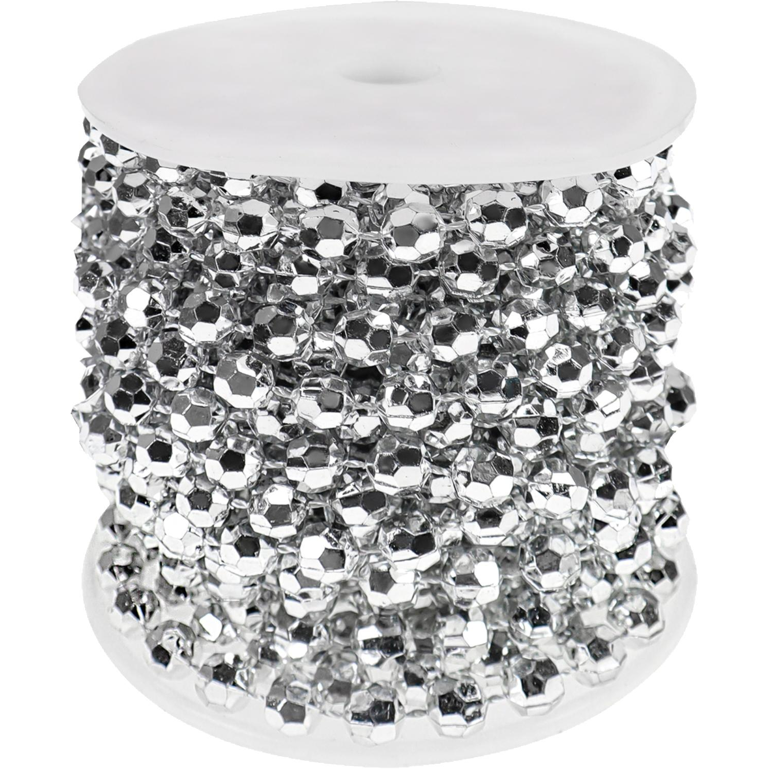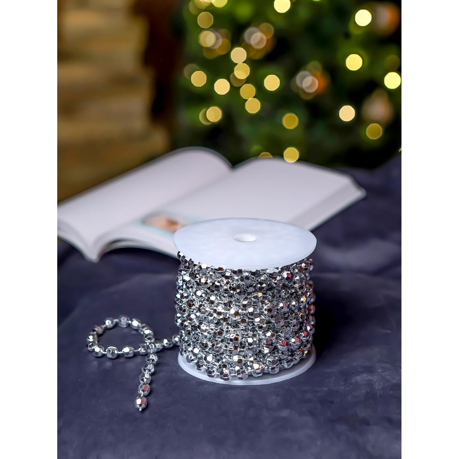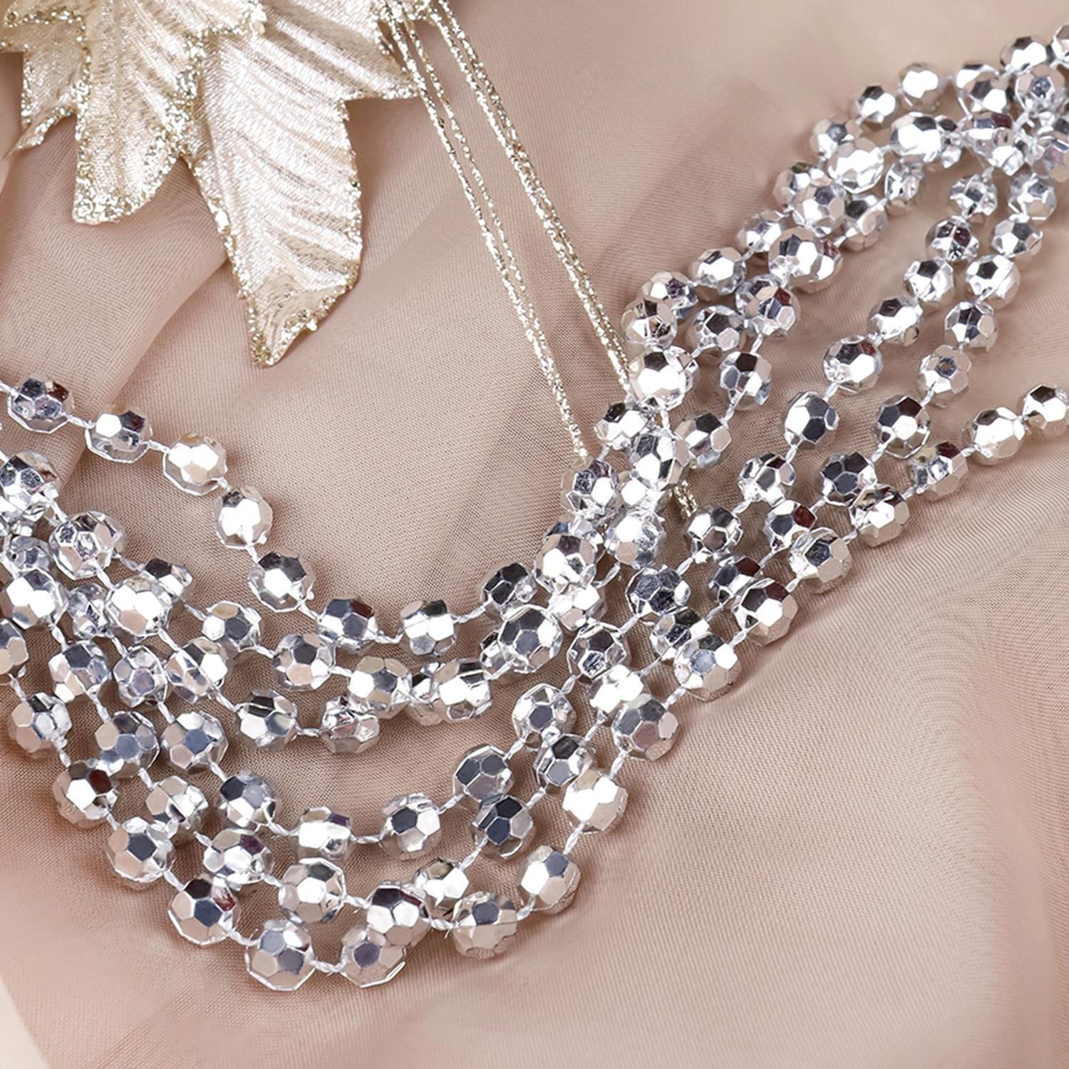 Бусы новогодние серебристого цвета предназначены для украшения ёлки и интерьера. Они эффектно переливаются на фоне хвои и подчёркивают праздничное оформление. Такой декор можно использовать также для украшения каминов, окон или мебели, добавляя блеск и завершённость композиции.