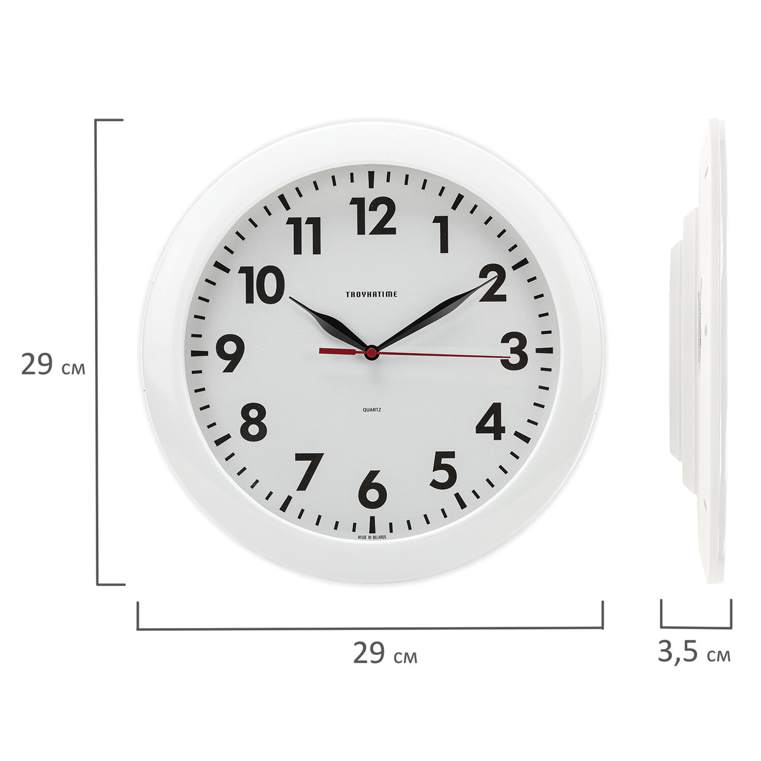 Габаритные размеры часов (ВхШхГ): 29×29×3,8 см.