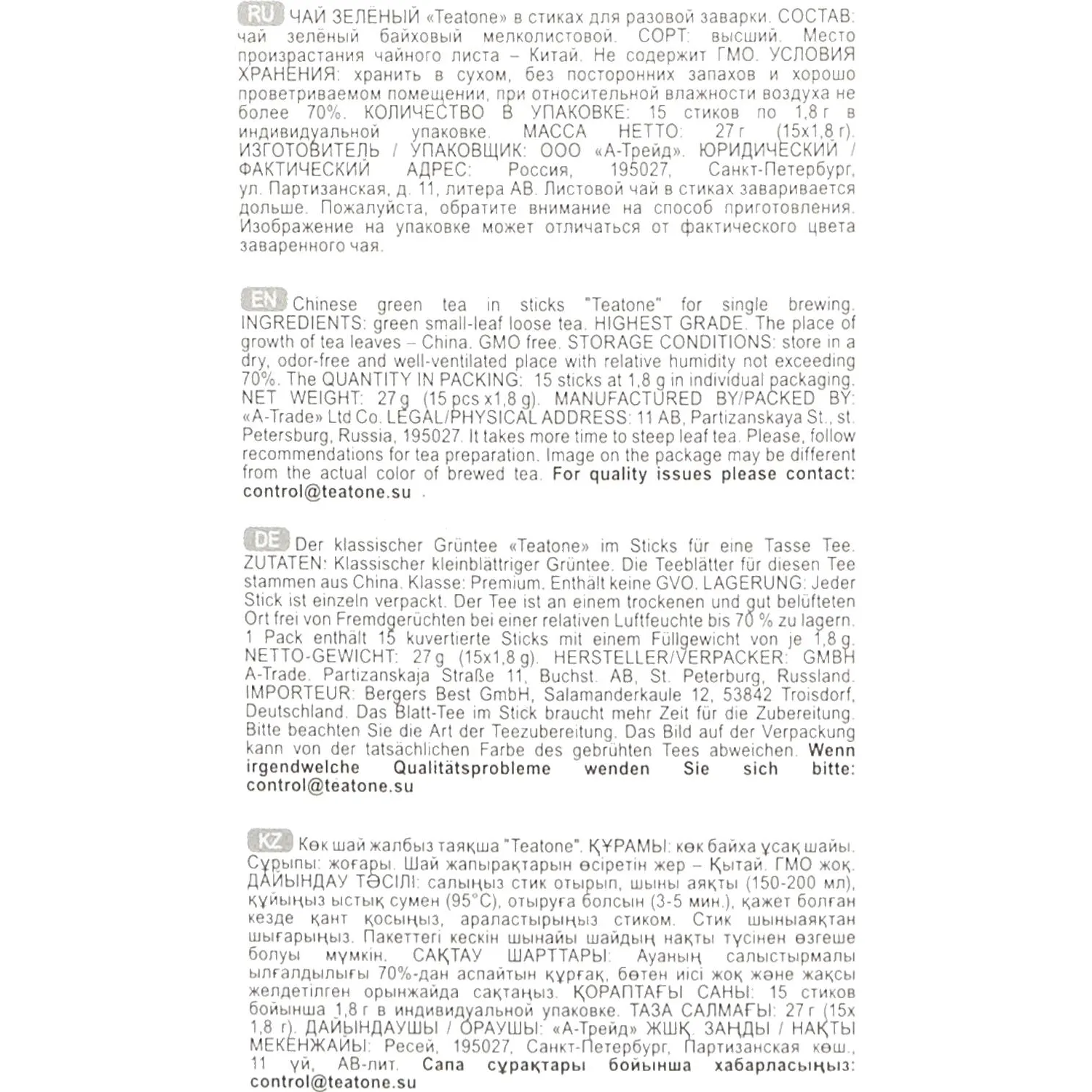 Чай зеленый Teatone 15 стиков. Вековые традиции выращивания и заваривания превратили зеленый чай в особый напиток, вкус и аромат которого несут умиротворяющую гармонию и ясность мысли. Деликатный зеленый чай сочетается с любым настроением и временем суток. Благодаря вакуумной упаковке каждого стика при извлечении не оставляет капель и брызг.