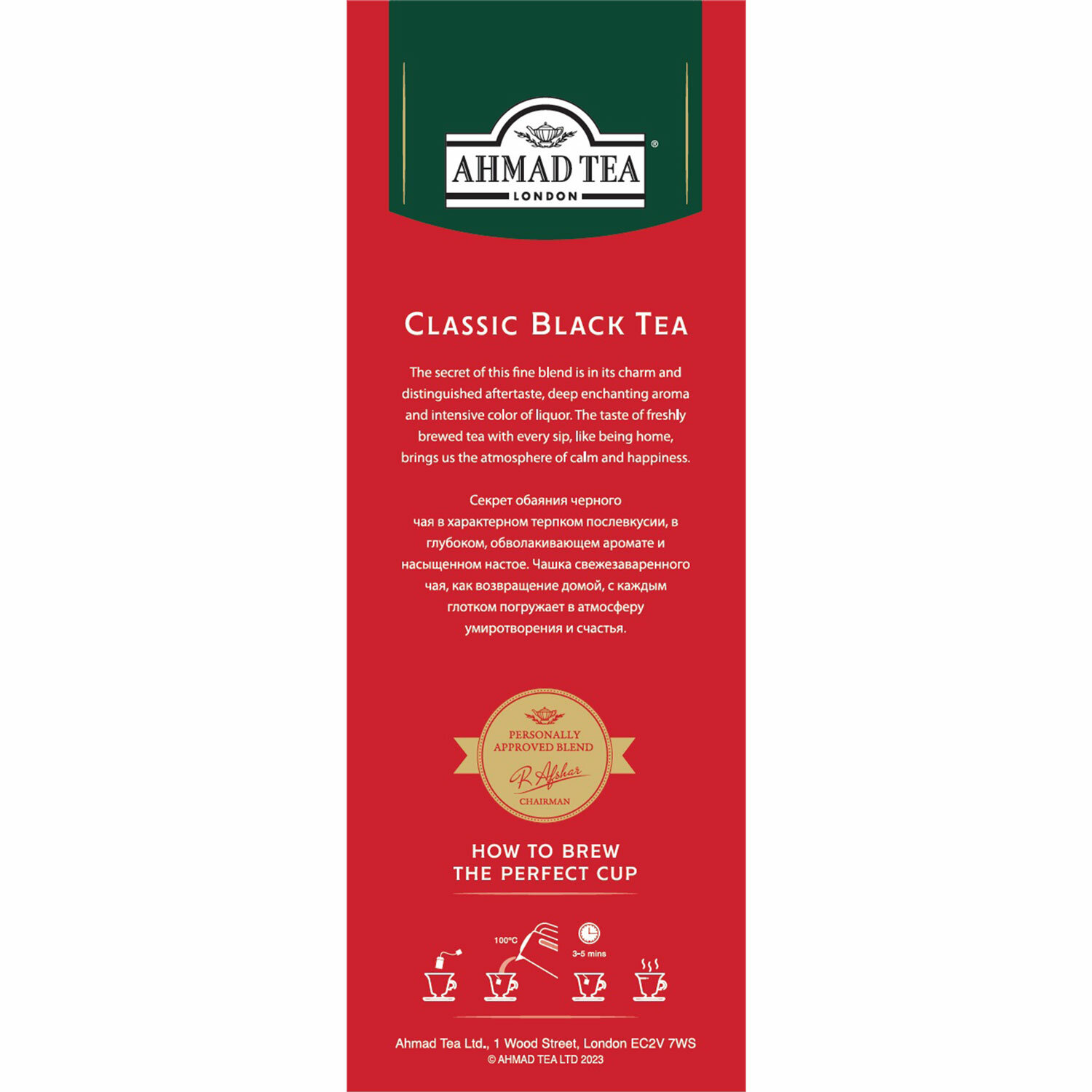 Чай черный Ahmad Tea Classic Black Tea 100 пакетиков. Секрет обаяния классического черного чая Ahmad Tea — в характерном терпком послевкусии, в глубоком, обволакивающем аромате и насыщенном настое. Чашка свежезаваренного чая — как возвращение домой, с каждым глотком погружает в атмосферу умиротворения и счастья. В состав входят ломанные листья традиционного черного чая (Orthodox).