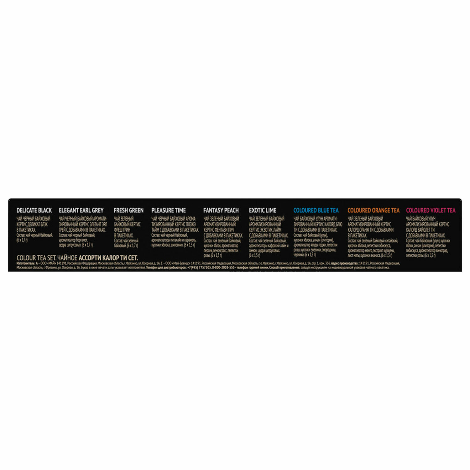 Состав: Coloured Blue Tea: чай байховый (улун), кусочки яблока, анчан (клитория), ароматизатор ягоды годжи, лепестки розы, кусочки ежевики, смородины, черники. Coloured Orange Tea: чай зеленый байховый китайский, кусочки яблока, лепестки гибискуса, ароматизатор манго, экстракт куркумы, лист мяты, кусочки ананаса. Coloured Violet Tea: чай байховый (улун), кусочки яблок, анчан (клитория), лепестки гибискуса, ароматизатор виноград, лепестки розы. Delicate Black: чай черный.
