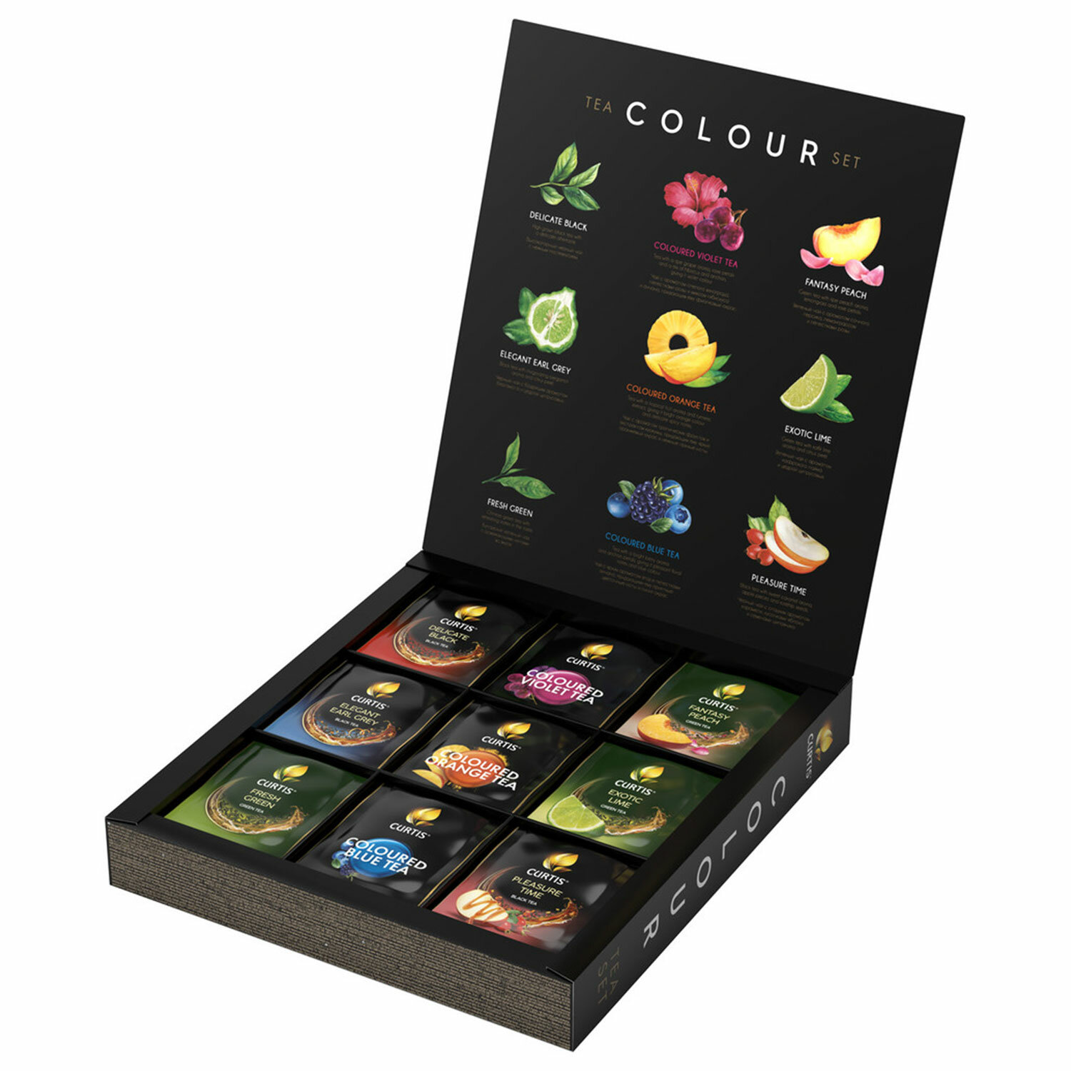 Чай ассорти Curtis Colour Tea Set 54 сашет. Отправьтесь в захватывающее чайное путешествие с нашим набором чая в пакетиках Curtis! Эта тщательно подобранная коллекция воплощает в себе многогранные вкусовые оттенки и является универсальным подарком для любого случая. В этом наборе вы найдете: яркий оранжевый чай с экзотическим ароматом манго. Изысканный фиолетовый чай с соблазнительным ароматом винограда. Освежающий синий чай с восхитительным ягодным ароматом. Несмотря на свою необычную окраску, все наши чаи остаются натуральными. Их яркие цвета получены благодаря таким природным ингредиентам, как анчан, гибискус и куркума. Каждый чай в нашем наборе — это симфония вкусов и ароматов, которая откроет для вас новые горизонты наслаждения. С этим подарочным набором вы раскрасите свою жизнь яркими красками и подарите себе незабываемые чайные моменты. Кроме того, этот набор идеально подходит для подарка близким или коллегам. Каждый из представленных сортов чая непременно покорит даже самого взыскательного гурмана.