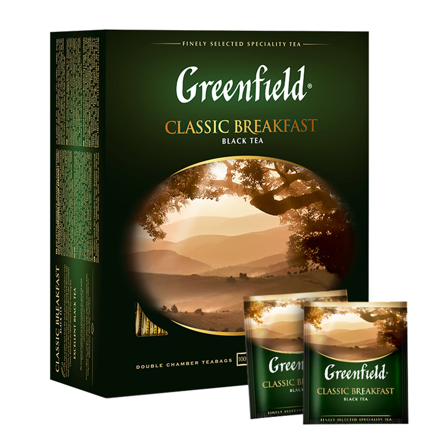Чай черный Greenfield Classic Breakfast 100 пакетиков. Greenfield Classic Breakfast — это пакетированный индийский черный чай со знаменитых плантаций Ассама, которые расположены на севере Индии. В заваренном виде лист приобретает медный оттенок, создавая золотисто-оранжевый настой. Такой чай бодрит и освежает в любое время суток, но обычно подается утром с молоком (или без него). Пакетированный черный чай быстро заваривается и удобен в использовании.