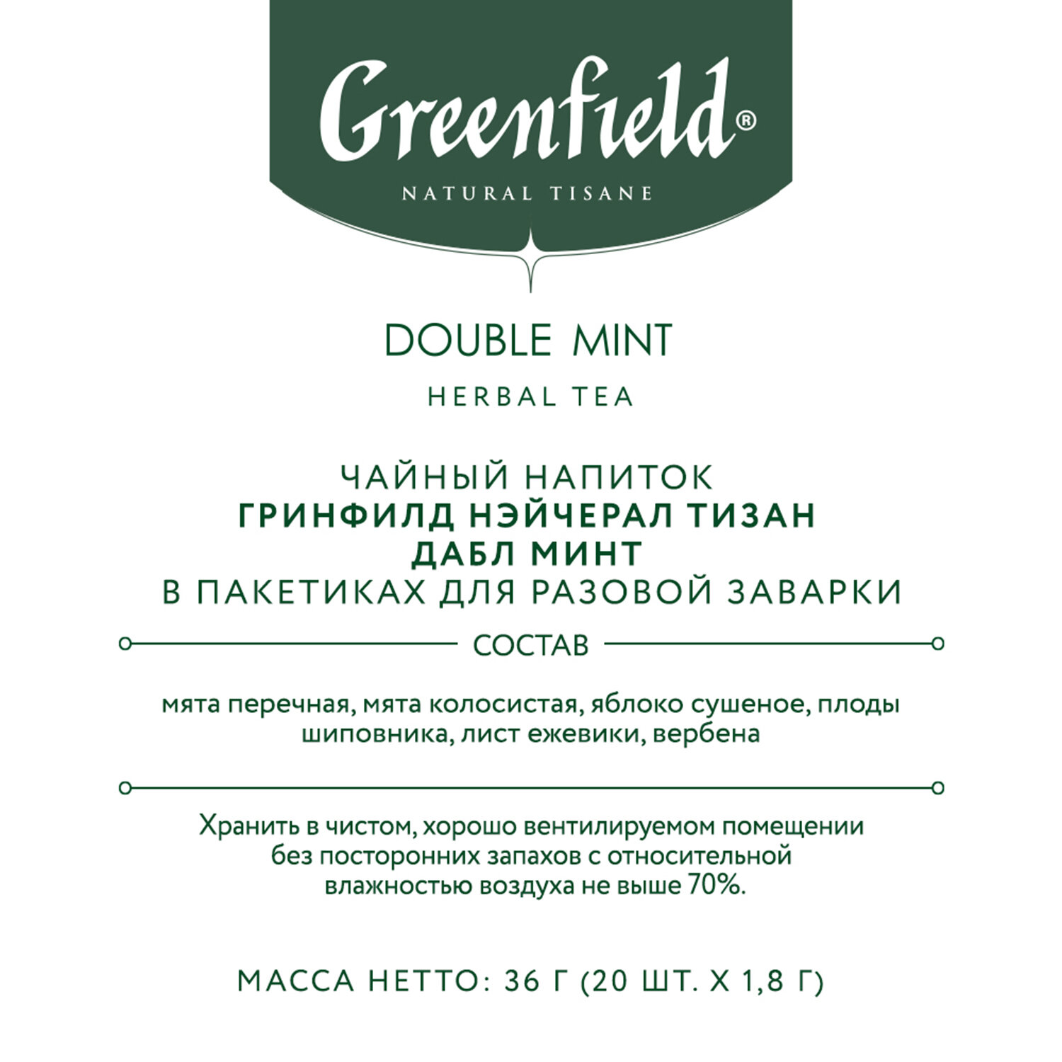 Чайный напиток травяной Greenfield Natural Tisane Double Mint 20 пирамидок. Купаж сладкой садовой и свежей перечной мяты, с добавлением яблока, шиповника и листьев вербены. Охлаждающий и освежающий напиток, прекрасно подходит для потребления в холодном виде!