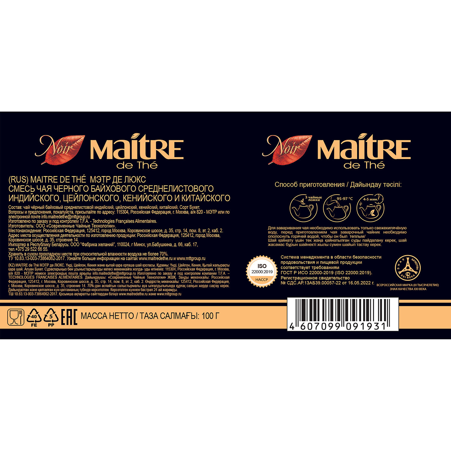 О товаре «Чай листовой черный Maitre de The Мэтр де Люкс 100 г»