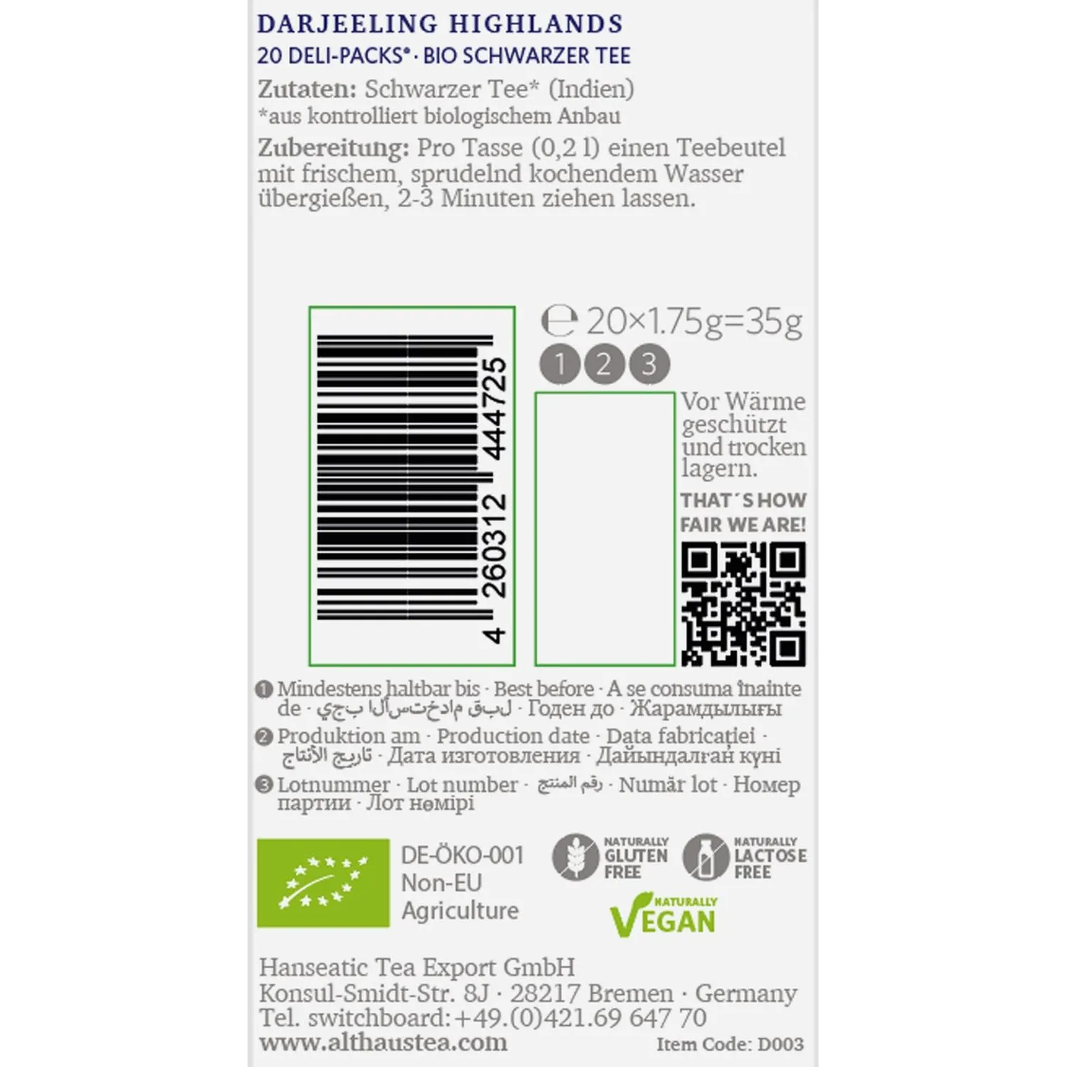О товаре «Чай пакетированный Althaus Darjeeling Highlands черный, 20x1.75г»