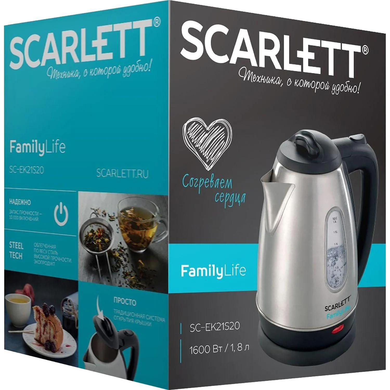 SCARLETT SC - EK21S20 отвечает всем современным требованиям пользователя. Он имеет увеличенный объем 1,8 литров, а мощность 1600 Вт позволяет вскипятить воду за считанные минуты. Чайник оснащён закрытым нагревательным элементом. Дополнительно он имеет несколько уровней безопасности, защищающих от перегрева и сгорания: прибор автоматически отключается при закипании и при малом количестве налитой жидкости. Широкое прозрачное окошко сбоку оснащено шкалой с уровнем. Удобное расположение кнопки включения способствует комфортной эксплуатации. Прибор оснащен фильтром «анти-накипь», расположенном в носике чайника и предотвращающим попадание накипи в кружку.