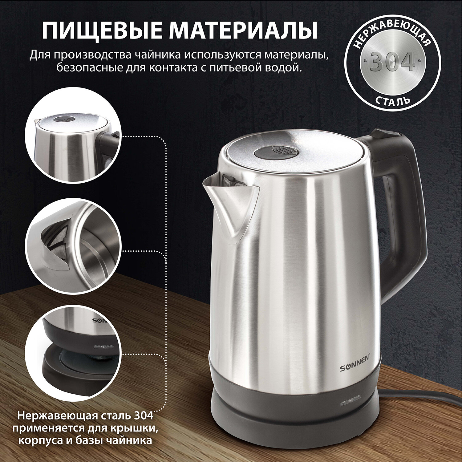 Чайник SONNEN KT-1785, 1,7 л, 2200 Вт, закрытый нагревательный элемент, нержавеющая сталь, 453420